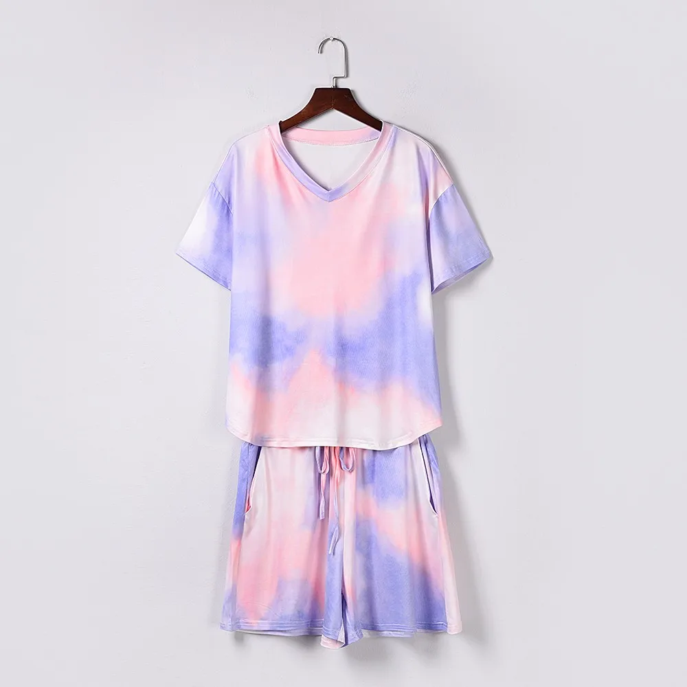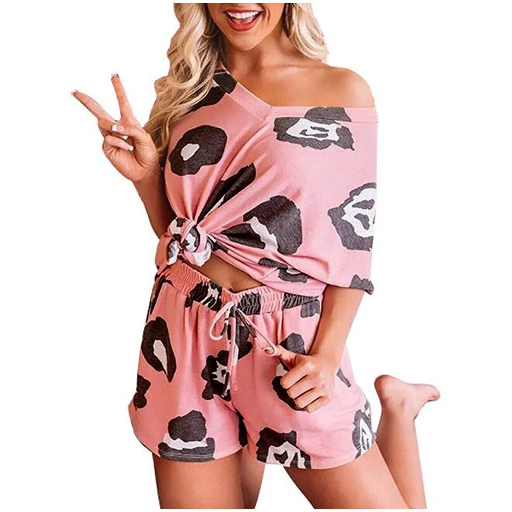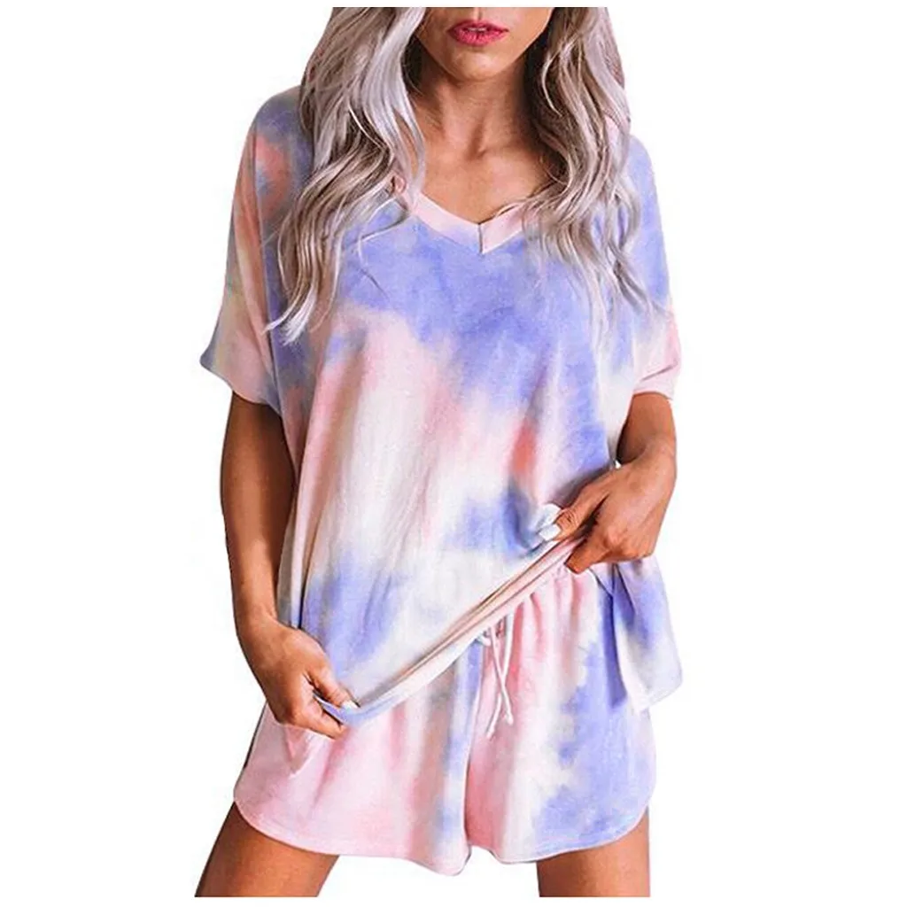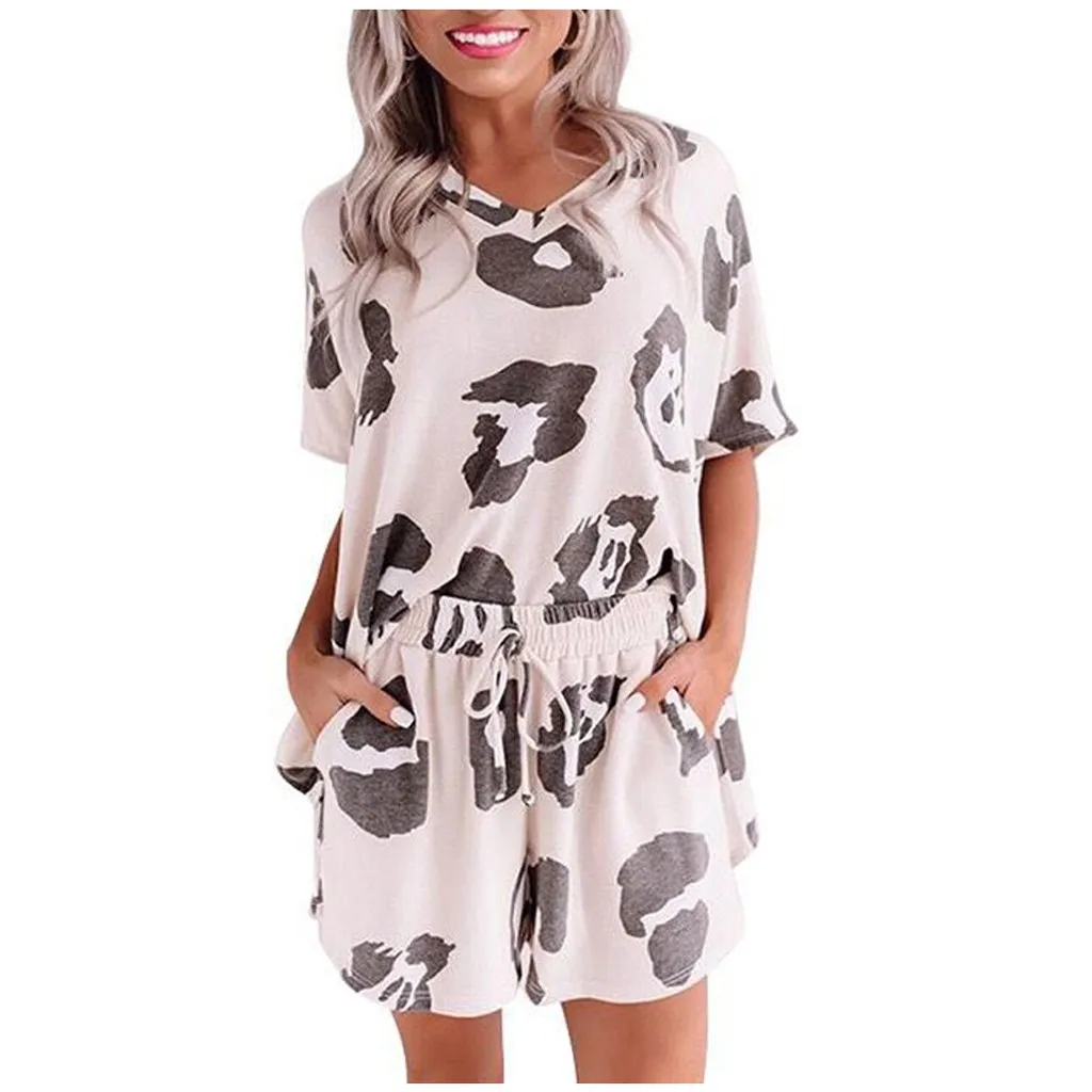 Shorts with elastic waist waistband, drawstring offers more convenient, loose fitting.This pajama sleep set top features v-neck short sleeve top and shorts for relaxed fit, stylish leopard and tie-dye print.