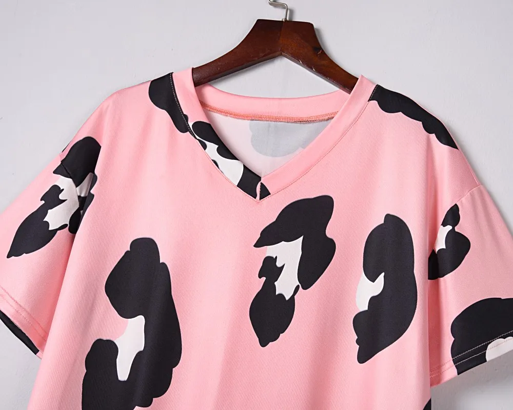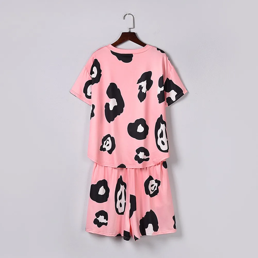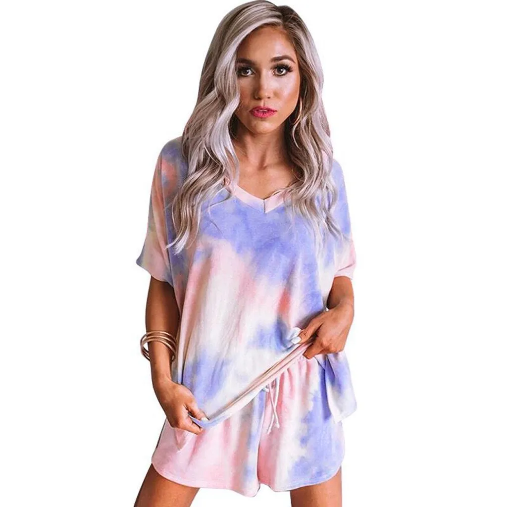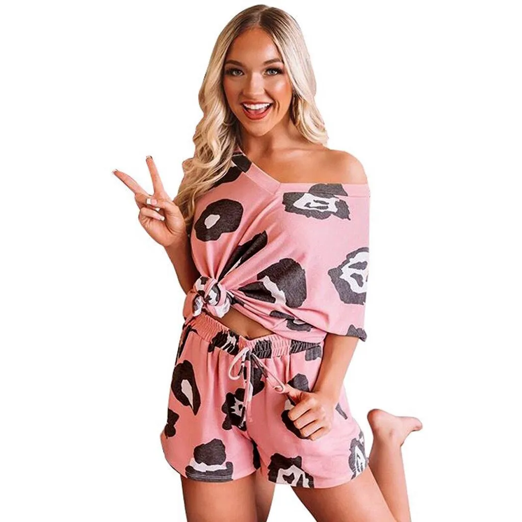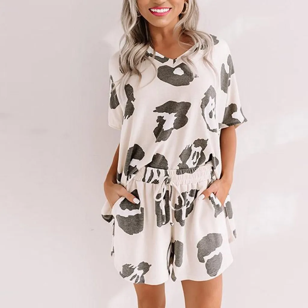 Shorts with elastic waist waistband, drawstring offers more convenient, loose fitting.This pajama sleep set top features v-neck short sleeve top and shorts for relaxed fit, stylish leopard and tie-dye print.
