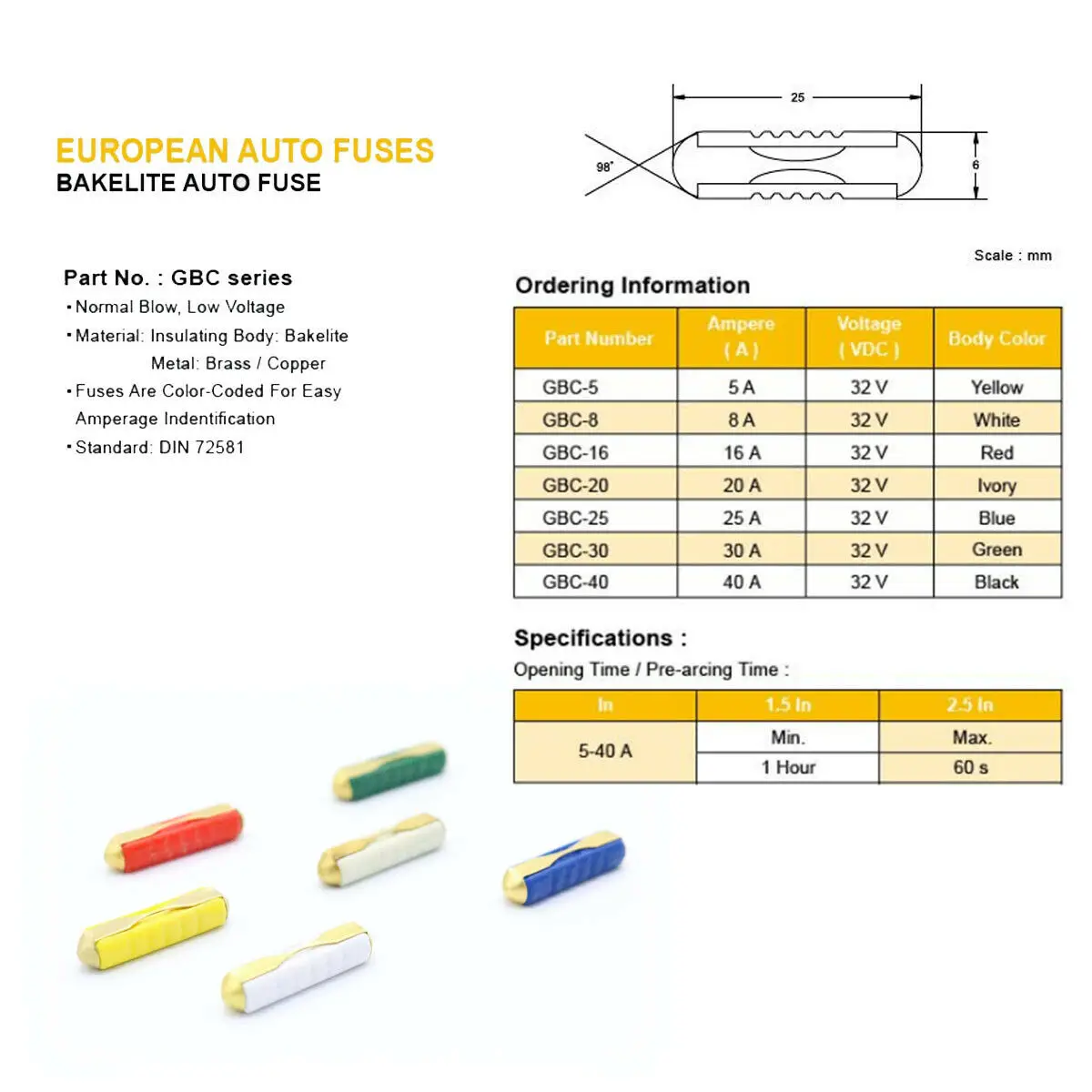 Бакелитовый автоматический предохранитель Часть №: серия GBC Нормальный удар, низкая мощность Материал: изоляционный корпус: бакелит Металл: латунь/медь Предохранители имеют цветовую кодировку для удобства Индентификация Amperage Стандарт: DIN72581 Напряжение: 32 В Размер: 6*25 мм Информация о заказе: 5А (желтый) * 5 8а (белый) * 5 16А (красный) * 5 20А (слоновая кость) * 5 25а (синий) * 5 30A (зеленый) * 5Упаковано коробкой с 1 держателем предохранителя