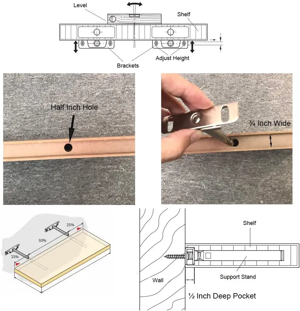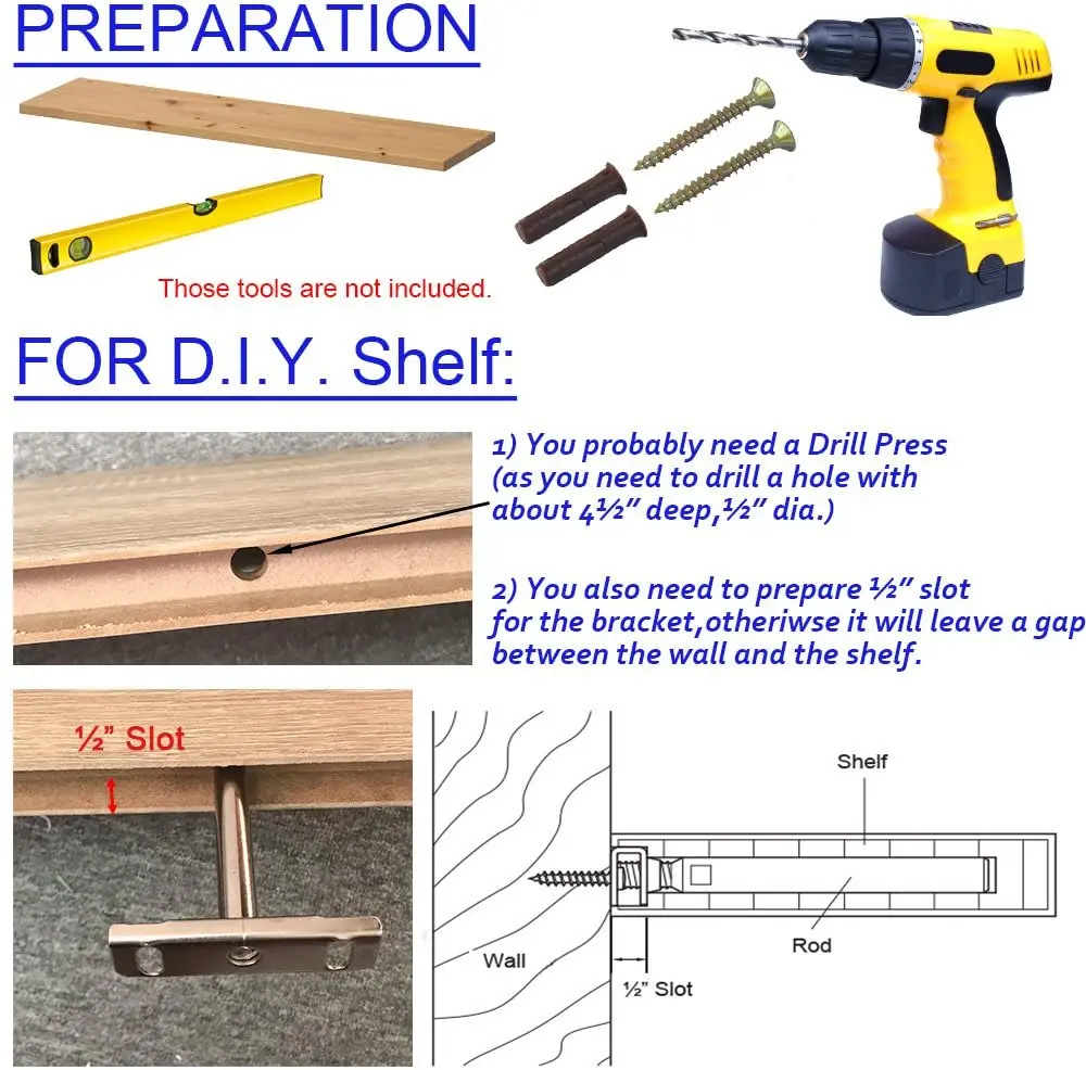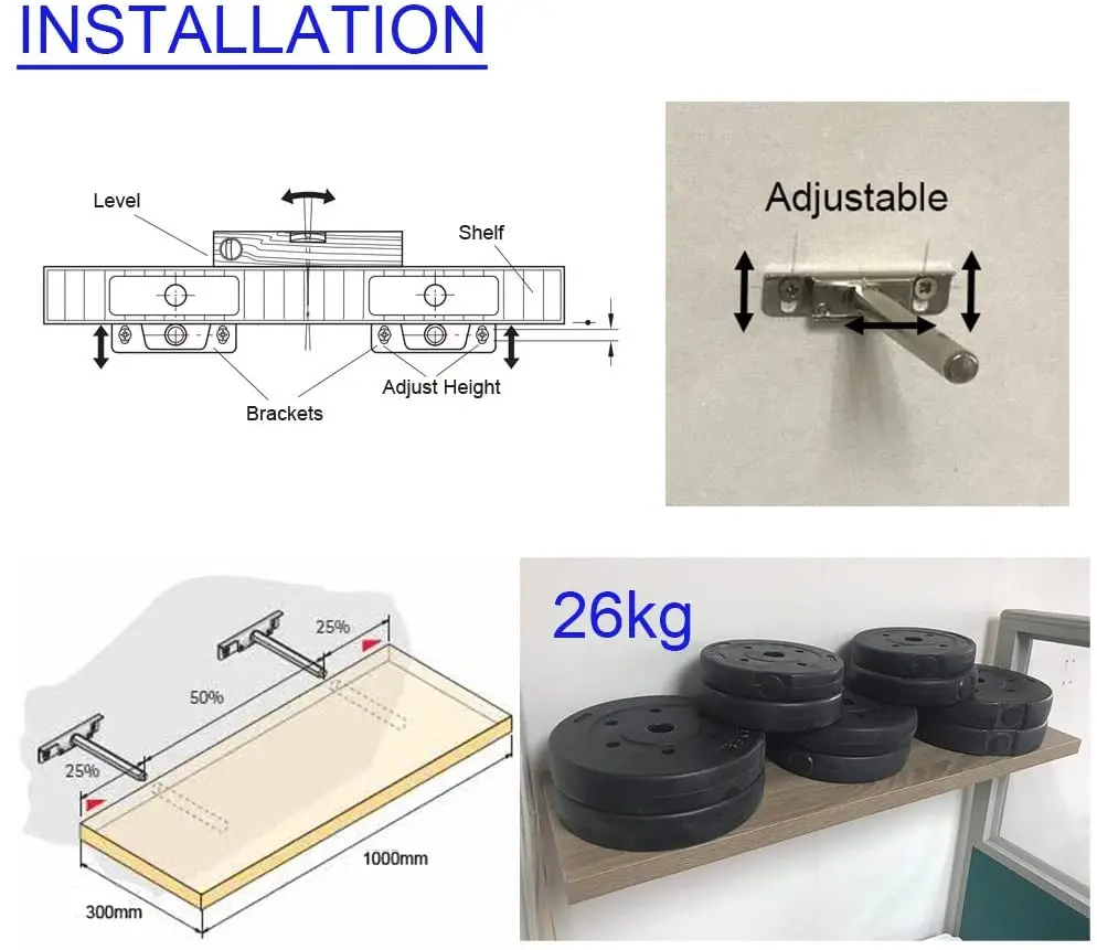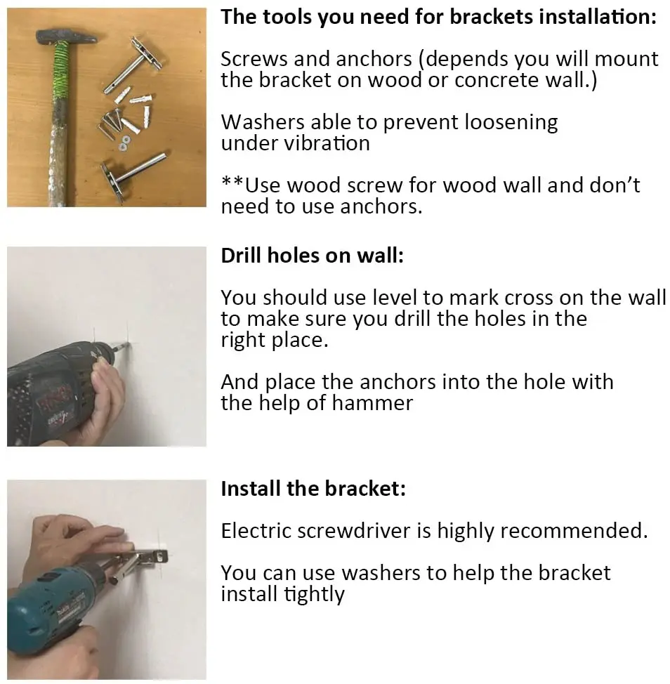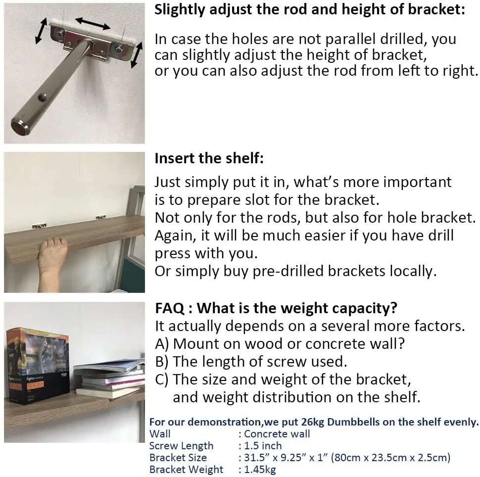 ✅✅Руководство по установке: Инструменты, которые вам нужны: Во-первых, каждому кронштейну нужны винты x2, якоря x2, шайба x2. Для инструментов вам нужно иметь уровень, сверло, электрическую отвертку, молоток. (Вам может потребоваться сверлильный пресс, если полка DIY) Просверлите отверстия на стене-Вы должны использовать уровень, чтобы отметить крест на стене, чтобы убедиться, что вы просверливаете отверстия в нужном месте. Установите кронштейн-вы можете использовать шайбы, чтобы помочь кронштейну установить плотно. Настоятельно рекомендуется электрическая отвертка. Регулировка-слегка Отрегулируйте стержень и высоту кронштейна Вставьте полку-просто положите ее в нее, что более важно, чтобы подготовить слот для кронштейна. Не только для стержней, но и для кронштейна отверстия. Снова, будет намного проще, если у вас есть сверлильный пресс с вами. Или просто купите предварительно просверленные скобы локально. ✅✅Часто задаваемые вопросы: каков вес? Это зависит от нескольких факторов. A. Крепление на деревянную или бетонную стену? B Длина использованного винта. C. Размер и вес кронштейна и распределение веса на полке ✅✅Для демонстрации мы равномерно кладем гантели на полку весом 26 кг. Стены: бетонная стена Винт Длина: 1,5 дюймов Кронштейн Размеры: 31,5 "x 9,25" x 1 "(80 см х 23,5 см х 2,5 см) Вес кронштейна: 1,45 кг ✅✅Этот товар будет нужен вам, чтобы сделать некоторые работы. Вам не только нужно сверлить отверстия для корпуса стержня, но и для всего кронштейна. В противном случае он оставит край между стеной и полкой. Вы также можете ознакомиться с нашей фотографией ✅✅Посылка включает в себя: 2xbrackets 4 xвинтов 4xanchors 4xwasher