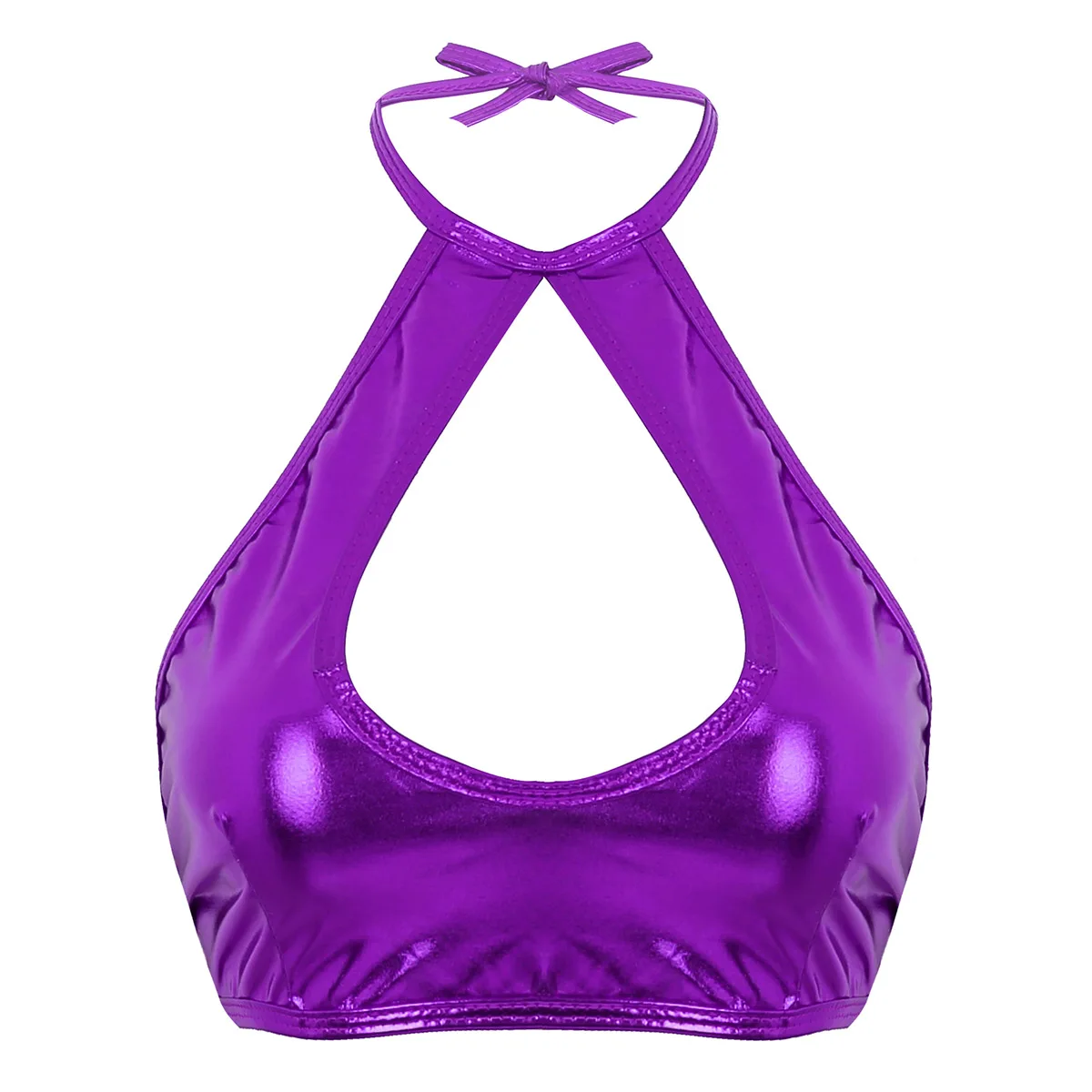 Женский короткий топ из искусственной кожи, Блестящий металлический Топ без рукавов с лямкой на шее и вырезами, для танцев на шесте