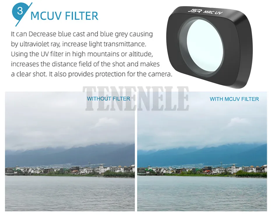 Он может уменьшить синий и Синий Серый, вызывая ультрафиолетовые лучи, увеличивает коэффициент пропускания светильник. Использование УФ-фильтра в высоких горных высотах, увеличивает Расстояние поля съемки и делает Четкий снимок. Он также обеспечивает защиту Для камеры.