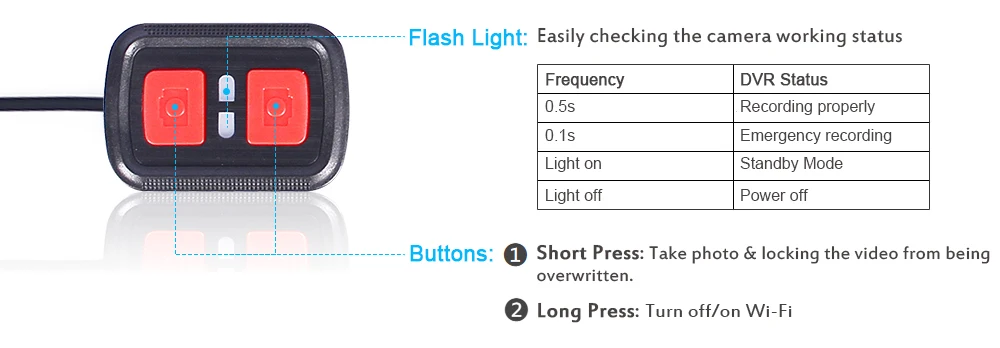 1. Нажмите любую кнопку, чтобы сохранить 2 фотографии и видеофайл с именем «key 001 002 003 ....», который не будет перезаписан. 2. Сброс WiFi. 3. Показать состояние камеры