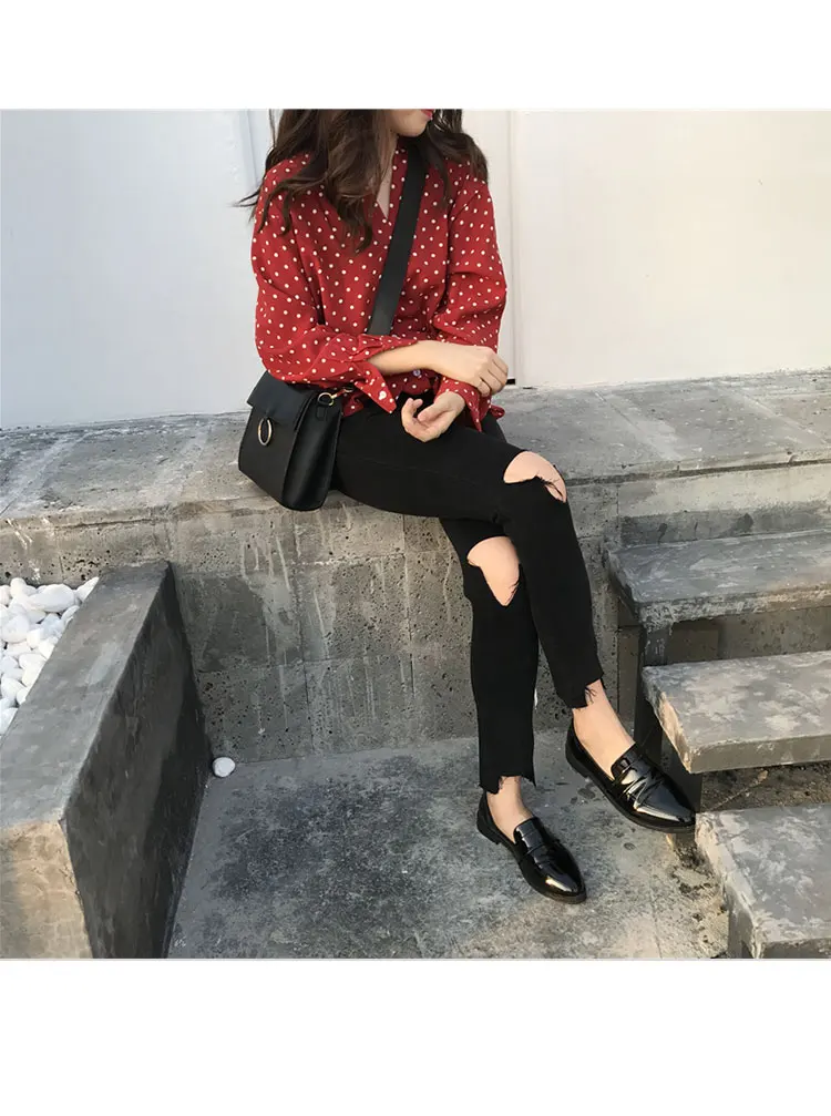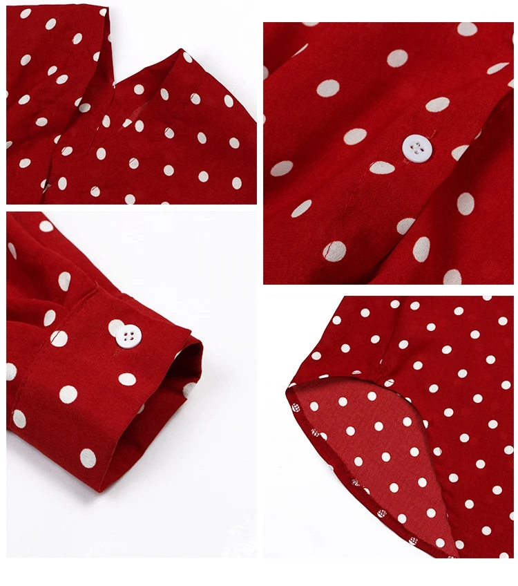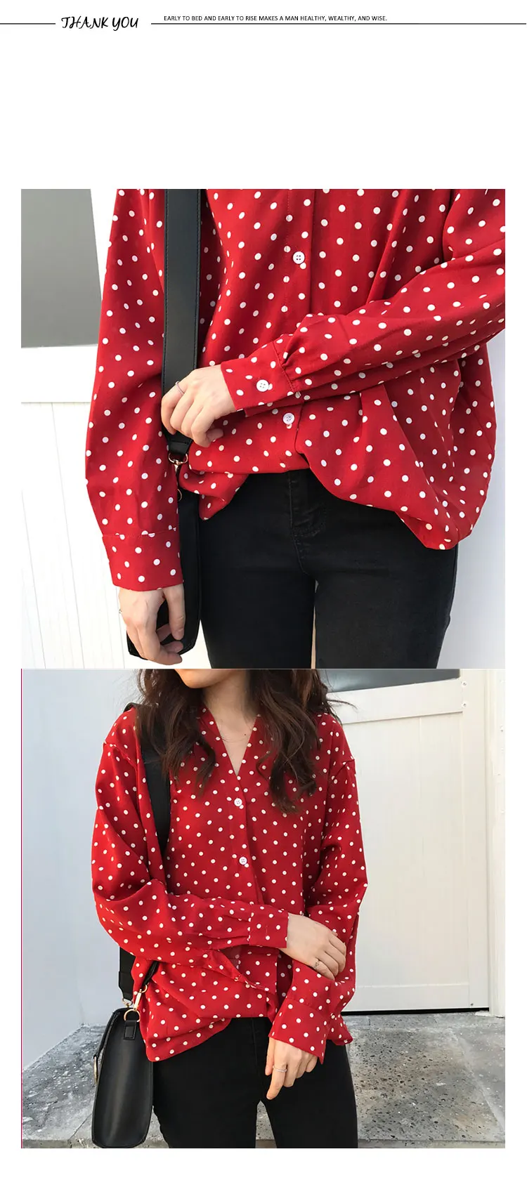Женские блузки, новинка 2020, винтажная красная блузка в горошек с v-образным вырезом, женские офисные рубашки с длинным рукавом, женские топы DF577 <
