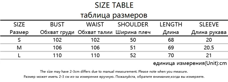 Таблица размеров для верхней части