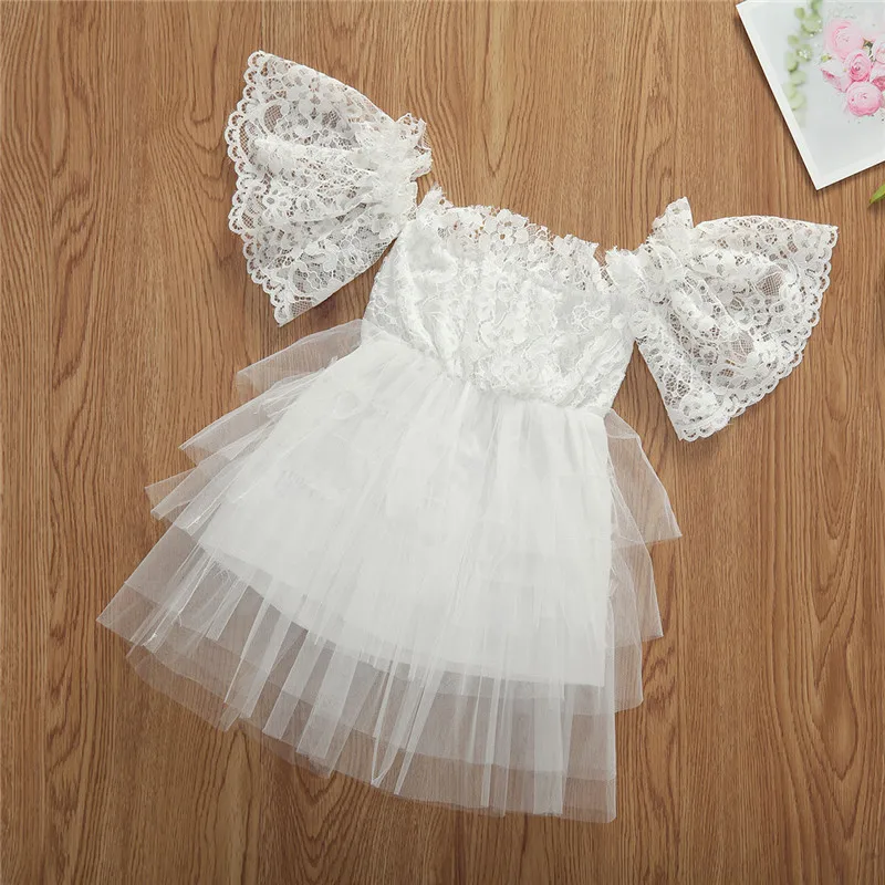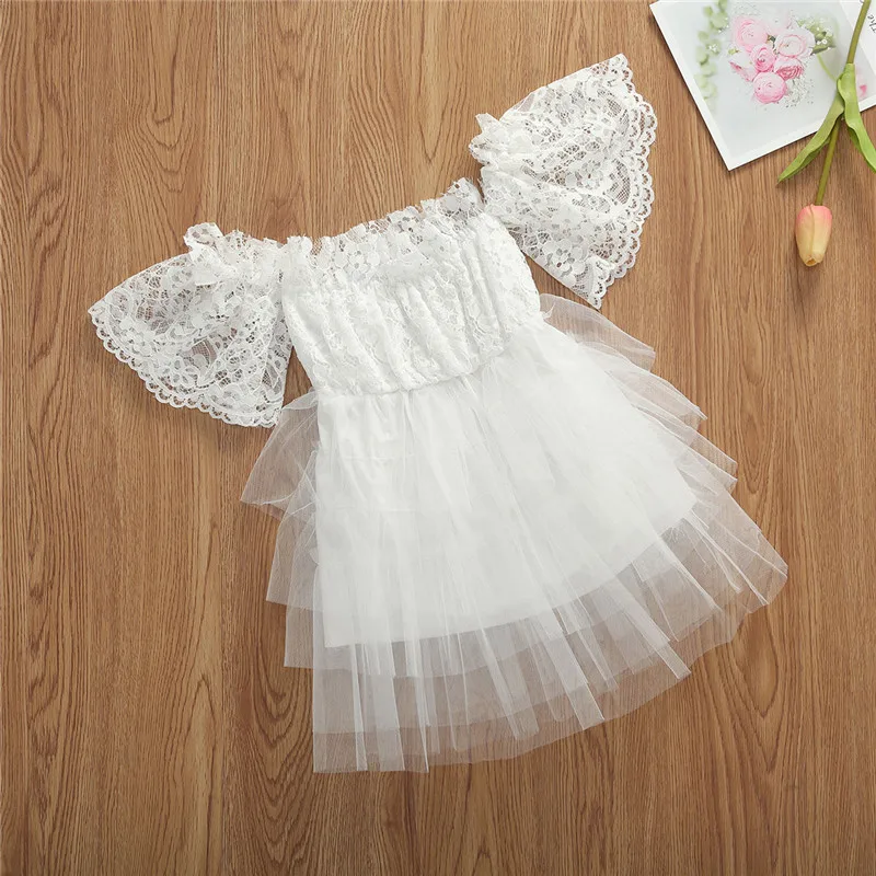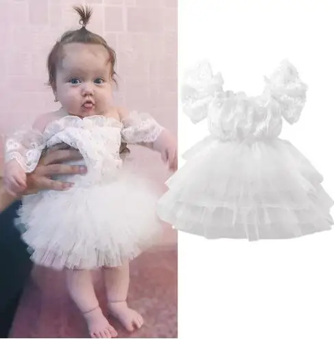 2020 Брендовое детское платье принцессы для маленьких девочек Кружевное белое вечернее бальное платье с короткими рукавами и открытыми плечами для малышей 0-24 месяцев!