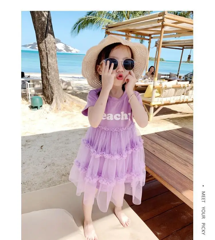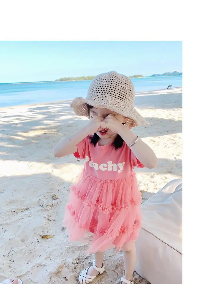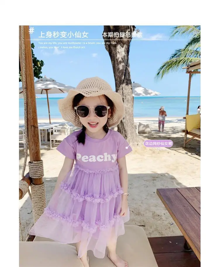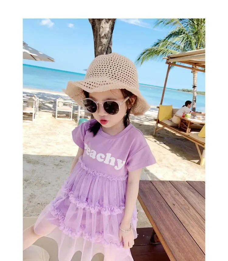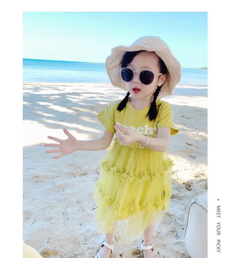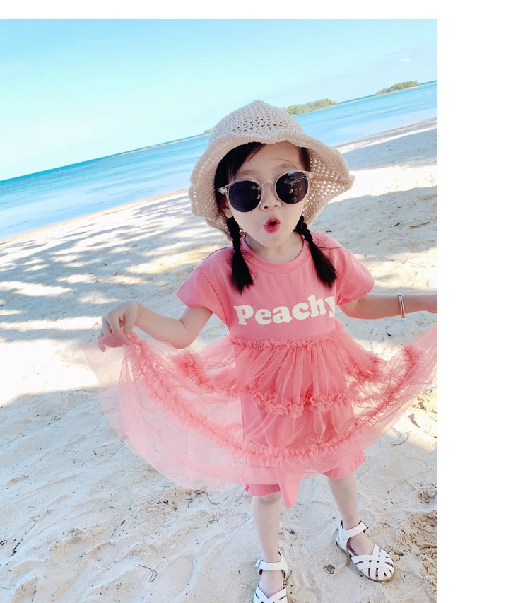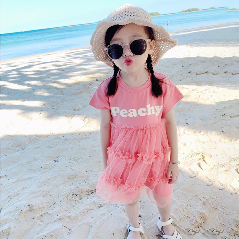 Летнее платье-пачка для маленьких девочек, платье-футболка, детская длинная футболка, одежда для маленьких девочек, пляжные Многослойные сетчатые платья с надписью ins