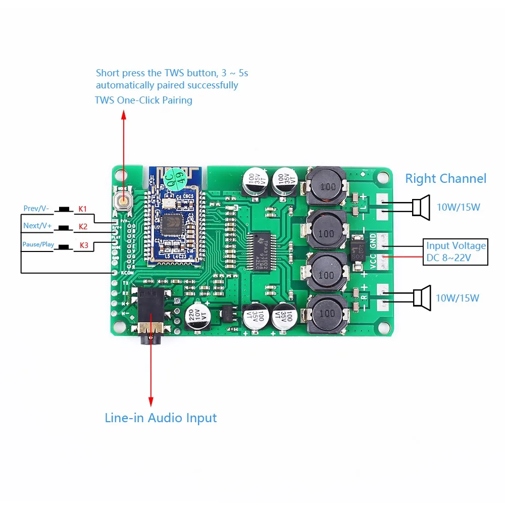 1. Описание: Этот модуль управляется чипом Beken BK3266 для обеспечения высокого качества звука и совместимости, а общая производительность превосходна. Модуль Bluetooth принимает режим без водителя. Клиенту нужно только подключить модуль к продукту приложения, и он может быстро осуществить беспроводную передачу музыки и насладиться веселой беспроводной музыкой .. 2. Особенности: 1>. Поддержка пользовательской модификации имени Bluetooth; 2>. Поддержка пользовательской модификации Bluetooth пароля; 3>. Пароль по умолчанию (1234) для повышения производительности безопасности; 4>. Поддержка настроек UART; 5>. Поддержка версии Bluetooth 5,0; 6>. Поддержка MP3/WMA/WAV формат музыки; 7>. Поддержка 6 сопряженных устройств; 8>. Поддержка включения/выключения кнопкой; 9>. Поддержка отключения; 10>. Поддержка обратной защиты; 11>. После включения модуля он автоматически подключится к последнему сопряженному устройству. При одновременном включении 6 сопряженных устройств последнее сопряженное устройство будет автоматически подключено. 3. Параметры: 1>. Название продукта: Плата усилителя мощности Bluetooth 5,0 2>. Рабочая Напряжение: DC 8,0 V-22,0 V 3>. Спецификация Bluetooth: Bluetooth V5.0 4>. Выходная мощность: 4,1>.15 Вт * 2 при 16 В 4A 4,2>.10 Вт * 2 при 12 В 4A 5>. Поддержка протокола Bluetooth: HFPV1.7, A2DPV1.2, AVRCPV1.5, AVCTPV1.2, AVDTPV1.2 6>. Рабочий ток:<= 20 мА 7>. Постоянный ток:<500uA 8>. Диапазон беспроводной передачи: около 10 метров 9>. Мощность передачи: класс 2, 4dbm 10>. Чувствительность:-81dBm<0.1% BER 11>. Диапазон частот: 2,402 ГГц ~ 2,480 ГГц 12>. Отношение сигнал-шум:>75 дБ 13>. Поддержка сопротивления динамика: 4 ~ 8 Ом 14>. Диапазон рабочих температур:-20 ℃ ~ 85 ℃ 15>. Диапазон рабочей влажности: 0%-95% относительной влажности 16>. Размер: 71*43*9,4 мм 4. Использование шагов: 1>. Подключите кнопки и микрофон и динамики 10 Вт или 15 Вт в качестве Схемы проводки, как показано на рисунке. 2>. Подключите правильное напряжение. 3>. Входной аудиосигнал. 4>. Сопряжение с телефоном. 5>. Воспроизведение музыки на телефоне. 6>. Проверка и использование. 7>. Для подключения модуля к ПК требуется конвертер USB в TTL и отправить по UART на ПК, чтобы изменить имя Bluetooth и Пароль Bluetooth. 5. Примечание: 1>. Во время применения модуля, пожалуйста, обратите внимание, чтобы избежать влияния источника помех, таких как усилитель мощности и схема повышения на модуле, И избегайте цепи подключения серии между циклом питания модуля и блоком высокой мощности, чтобы улучшить SNR всей машины. 2>. Не рекомендуется устанавливать в металлический чехол. 6. Применение: 1>.DIY динамик; 2>. Интеллектуальное управление голосом; 3>. Преобразование сигнала Bluetooth. 4>. Стерео bluetooth-динамик; 5>. Стерео bluetooth-гарнитура; 6>. Беспроводные звонки по Bluetooth; 7>. Управление Bluetooth; 8>. Мультимедийное оборудование; 7. Посылка: 1>.1 шт. Bluetooth 5,0 Усилитель мощности;