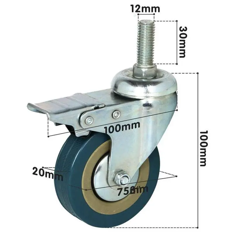 Изготовлен из сверхпрочной стали и ПВХ Двойной Шарикоподшипник поворотная головка с резьбой м 12 болт крепления колеса Тип: подшипник скольжения, сверхпрочный ПВХ включает в себя 2 х поворотных колеса, 2 х поворотные с тормозными колесами Номинальная нагрузка: 200 кг/440 фунтов (50 кг/110 фунтов каждый) Отлично подходит для различных применений, от «сделай сам» до промышленного применения (магазины, школы, дома и больницы)