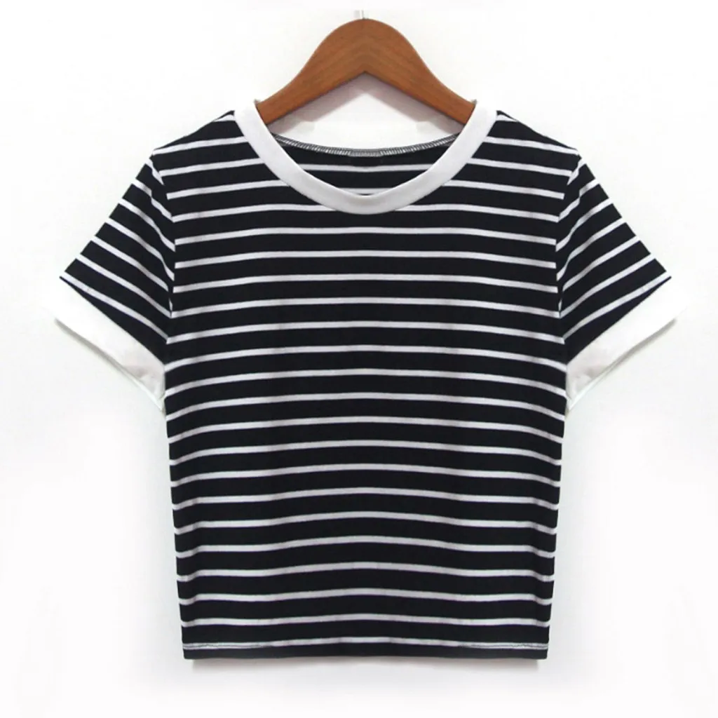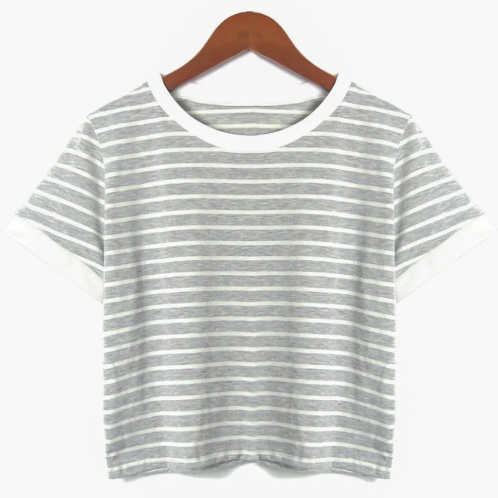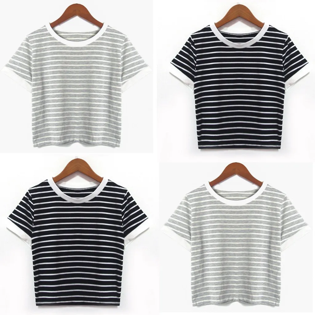 Повседневная футболка с короткими рукавами с принтом в полоску и коротким рукавом. Очень круто и модно носить на улице, специально для летнего пляжного музыкального фестиваля. Лучше всего сочетать его с шортами и босоножками-гладиаторами.