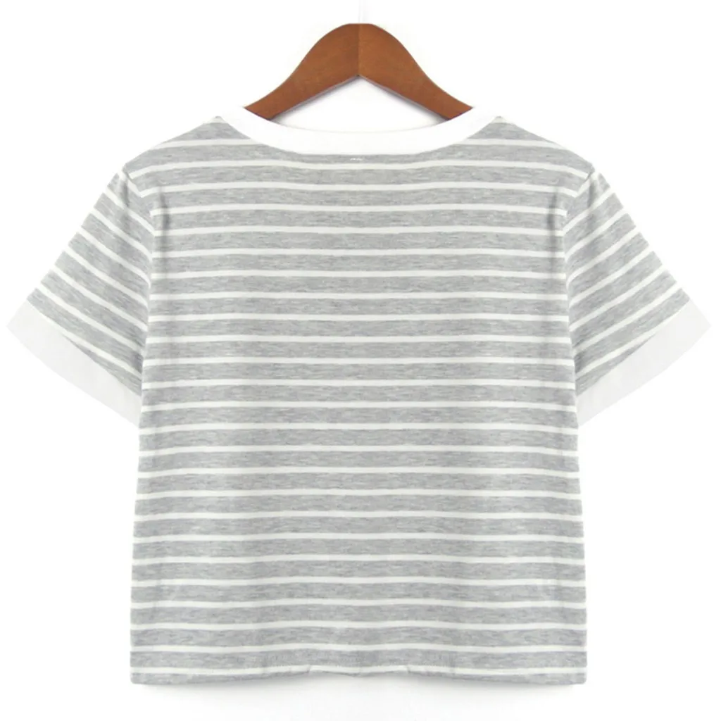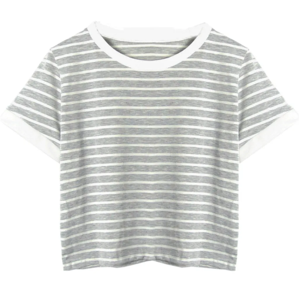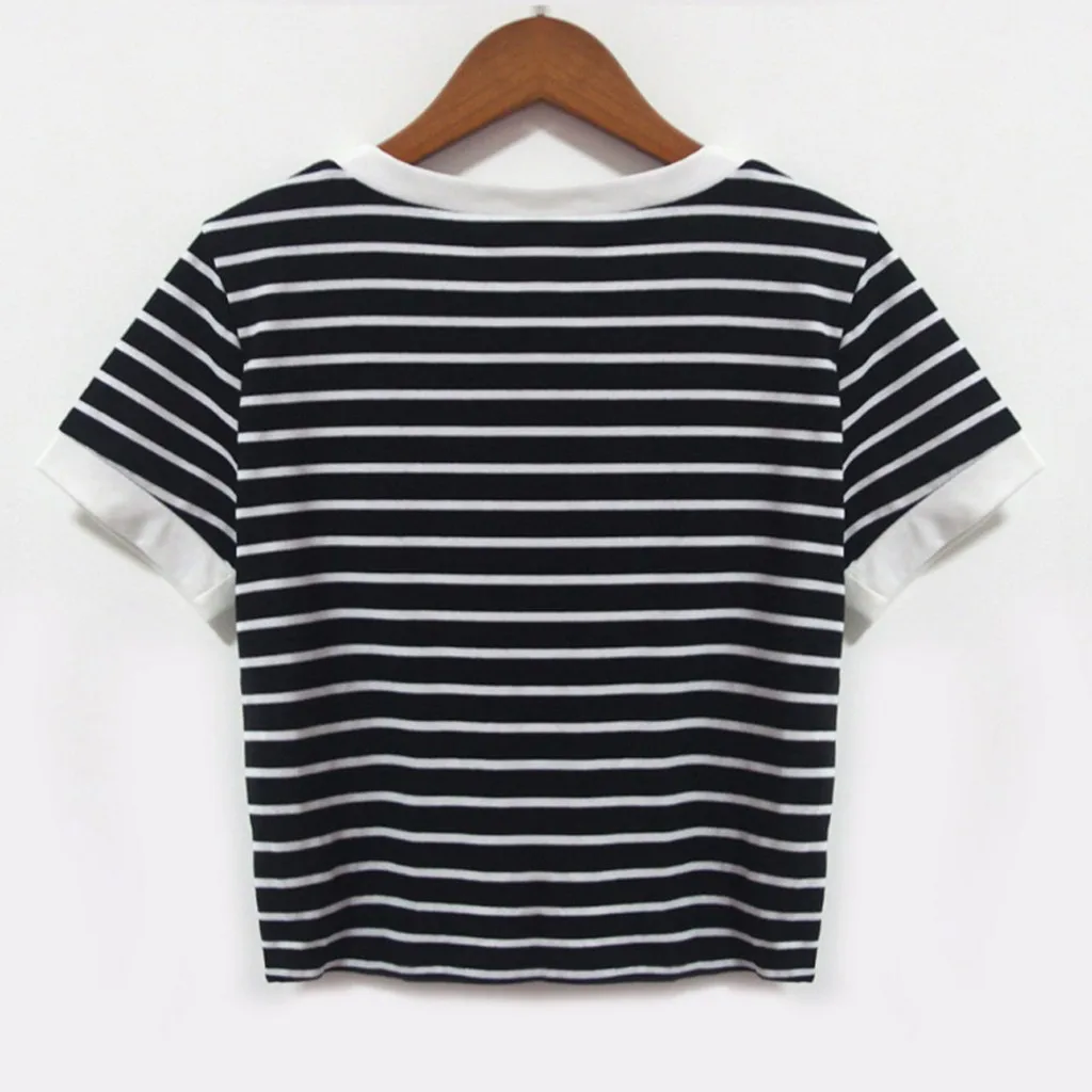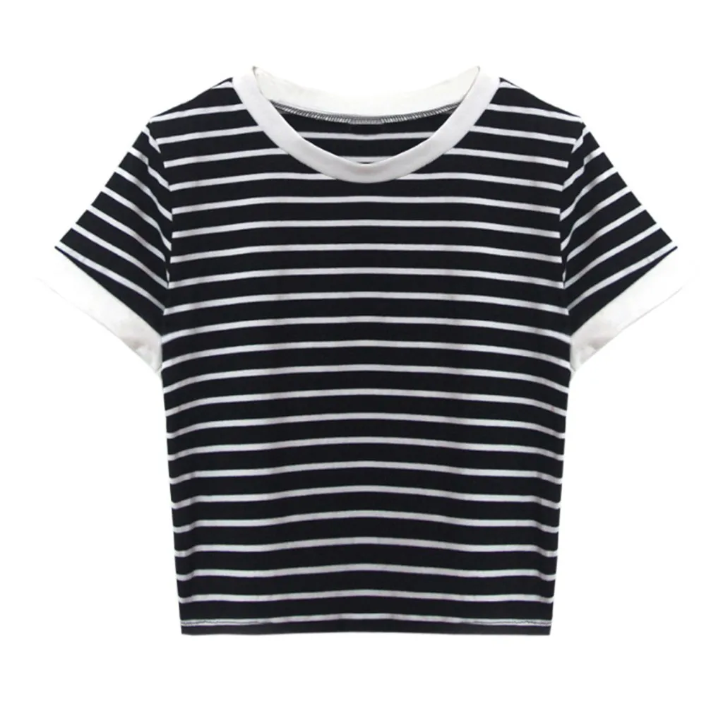 Повседневная футболка с короткими рукавами с принтом в полоску и коротким рукавом. Очень круто и модно носить на улице, специально для летнего пляжного музыкального фестиваля. Лучше всего сочетать его с шортами и босоножками-гладиаторами.