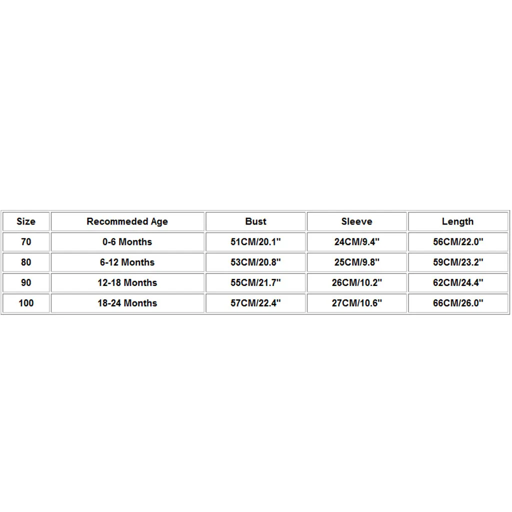 | Size | Recommeded Age | Bust | Sleeve | Length |