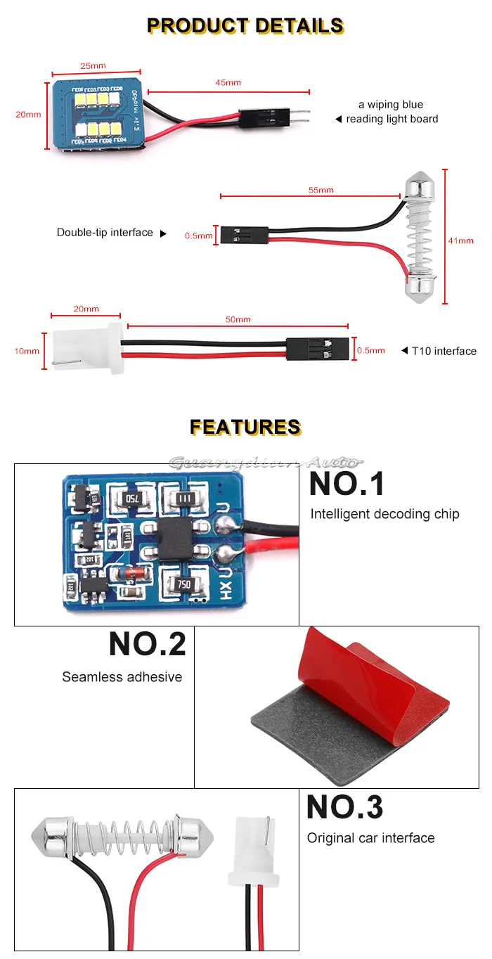 Название товара: светильник для чтения/купольное освещение/светильник щение Напряжение: 12 В Максимальная мощность: 2 Вт Световой поток: 200-250 лм Цветовая температура: 6000K-6500K (как показано на рисунке) Количество СВЕТОДИОДНЫЙ Дов: 8 шт. (6 шт., белый и 2 шт., синий/голубой/теплый белый) Характеристики бусин лампы: чип 2835 Длительный срок службы, низкое энергопотребление Прочная клейкая лента, проста в использовании. Посылка входит 1 【 1 комплект 】: 1 шт 2835 8SMD светодиодный ные лампы 1 шт. адаптер T10 1 шт. адаптер для купола гирлянды