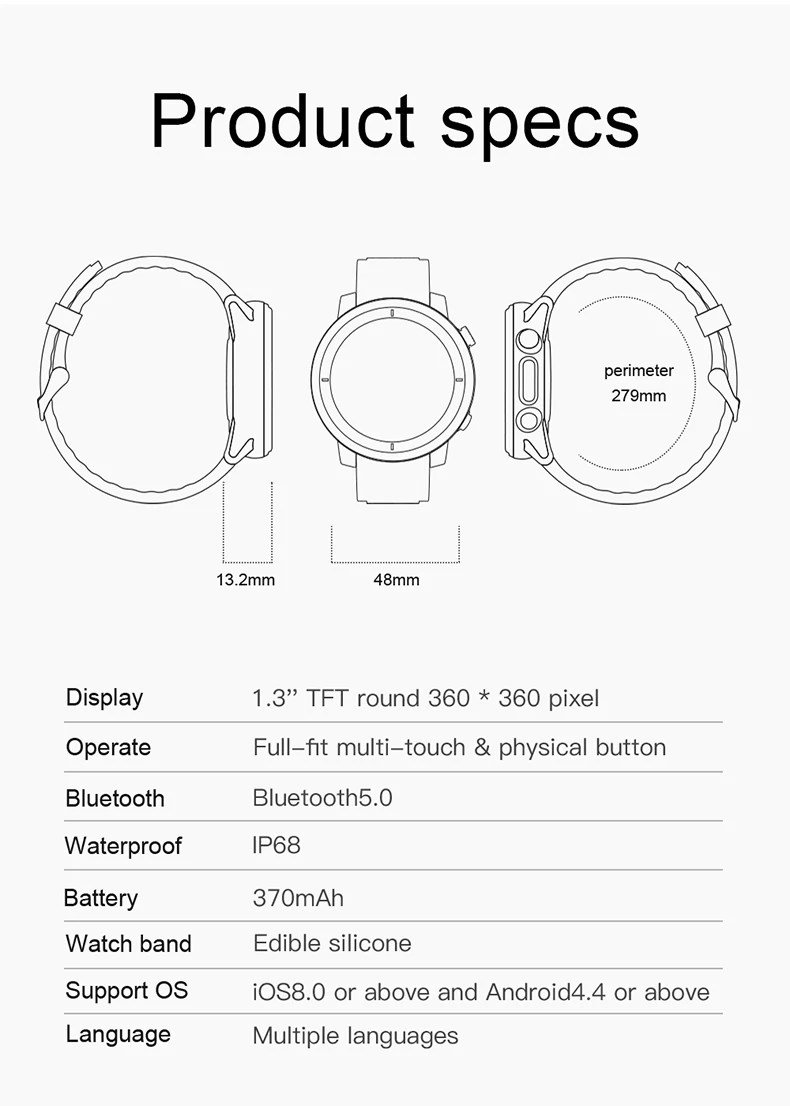 Platform:"RTL8762C Main frequency: 40MHz Memory RAM: 128KB, ROM: 128KB extend 128MB" Product type:Fashion smart watch Quality Standard:GB4943.1-2011;GB/T22450.1-2008 Size:48*48*13.2mm with band 231mm Display:1.3'TFT round screen 360*360 pixel Touch:Full touch screen Casing:"Alloy watch case, mineral glass mirror, plastic back case." Strap:"Leather with TPU band, Ediable Silicone , Milanese Magnetic Steel for option" Charging:"Magnetic charger, 1.5 hour for full charge" Green Product:"CE, RoHS"