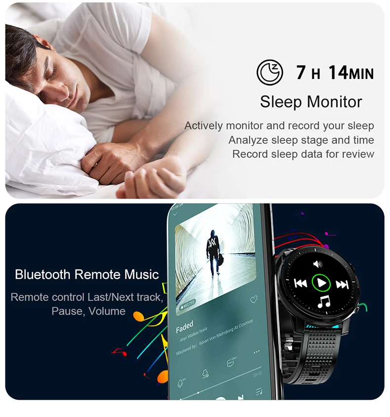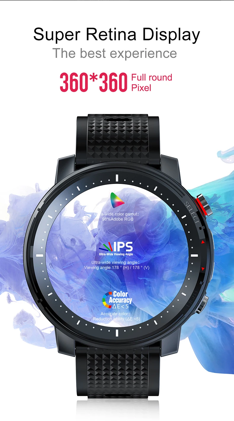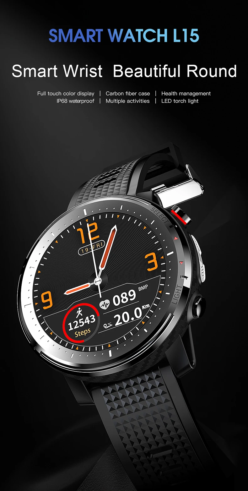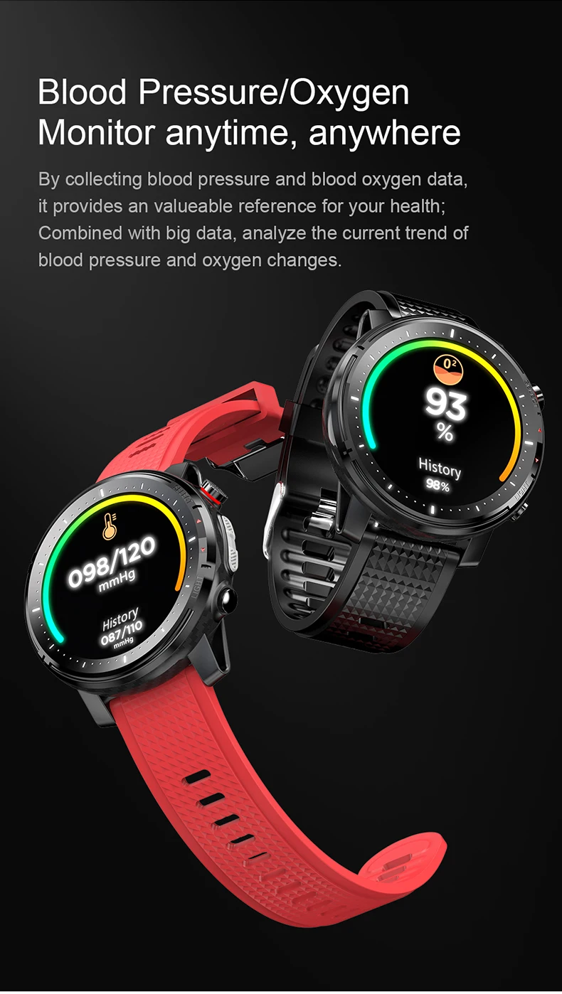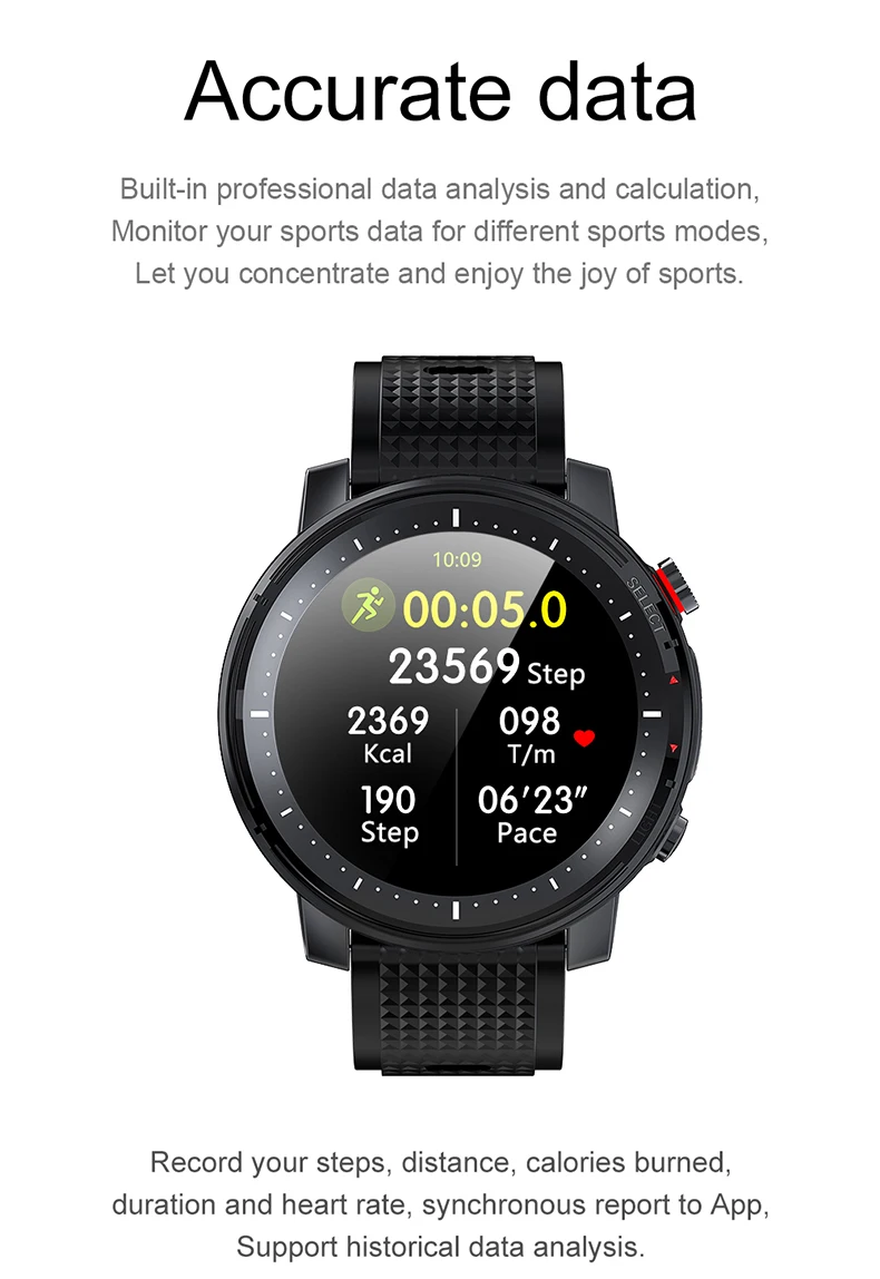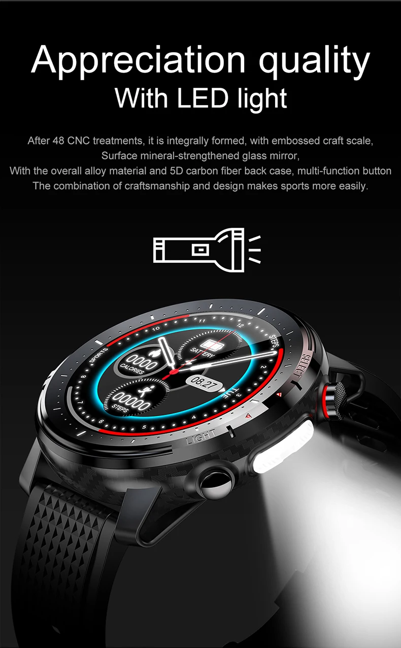 Selling points:"IP68 Waterproof, 1.3inch IPS 360*360 pixels full round display, 370mAh battery, 7 days battery life, flashlight. " Main Features:"Heart rate, ECG, blood pressure/oxygen, pedometer, stopwatch, music control, Bluetooth camera, flashlight."
