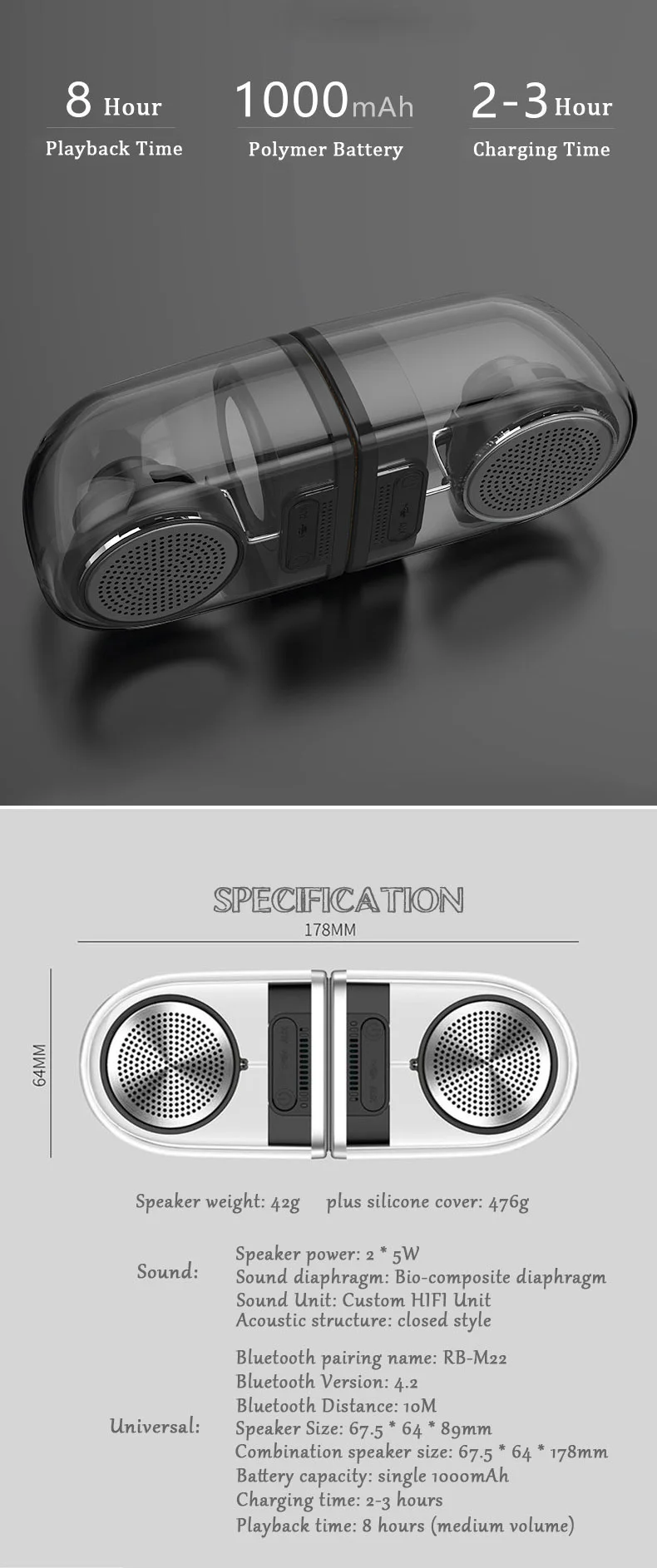 OVEVO TWS водонепроницаемые магнитные bluetooth-колонки True Wireless Характеристика: 1,5 м защитой от падений, IPX5 водонепроницаемый-в помещении и на открытом воздухе, не давят Двойной громкоговоритель 5 Вт Импортная звуковая катушка CAPTON Один из них разделен на два объемных стереосистемы Литиевая батарея 1000 мАч-8 часов непрерывного воспроизведения музыки Оригинальный отдельный Магнитный дизайн Получил премию немецкого IF Design Award 2018 Скандинавский полностью прозрачный минималистичный стиль DuPont hanging edge-захватывающий опыт, трехмерное удовольствие Характеристики: Время воспроизведения: около 6 часов (средняя громкость) Входная мощность: 5 В; 500 мА Мощность (RMS): 2x3W Чувствительность: -38dBm Модель: D10 Версия Bluetooth: V4.2 Расстояние: 10 м (без препятствий) Поддержка профиля: AVRCP/A2DP/HFP/HSP Размер динамика: 76x63x92мм Время зарядки динамика: около 2-3 часов Рабочая температура: -10 ~ 50 градусов Цельсия Динамик Батарея: 2x3.7V/1000 мАч Двойной размер динамика: 68x64x178мм Частота: 2,40 ГГц ~ 2,48 ГГц Вес: 476 г Включая: 1X Кабель для передачи данных, 1 руководство пользователя, 2x Динамик, 1x силиконовый чехол