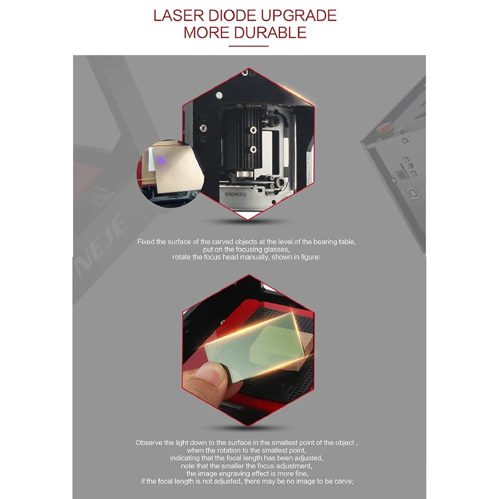 Оснащен 405нм лазерной трубкой, высокомощным лазером, более прочным, безопасным и гравированным глубже.