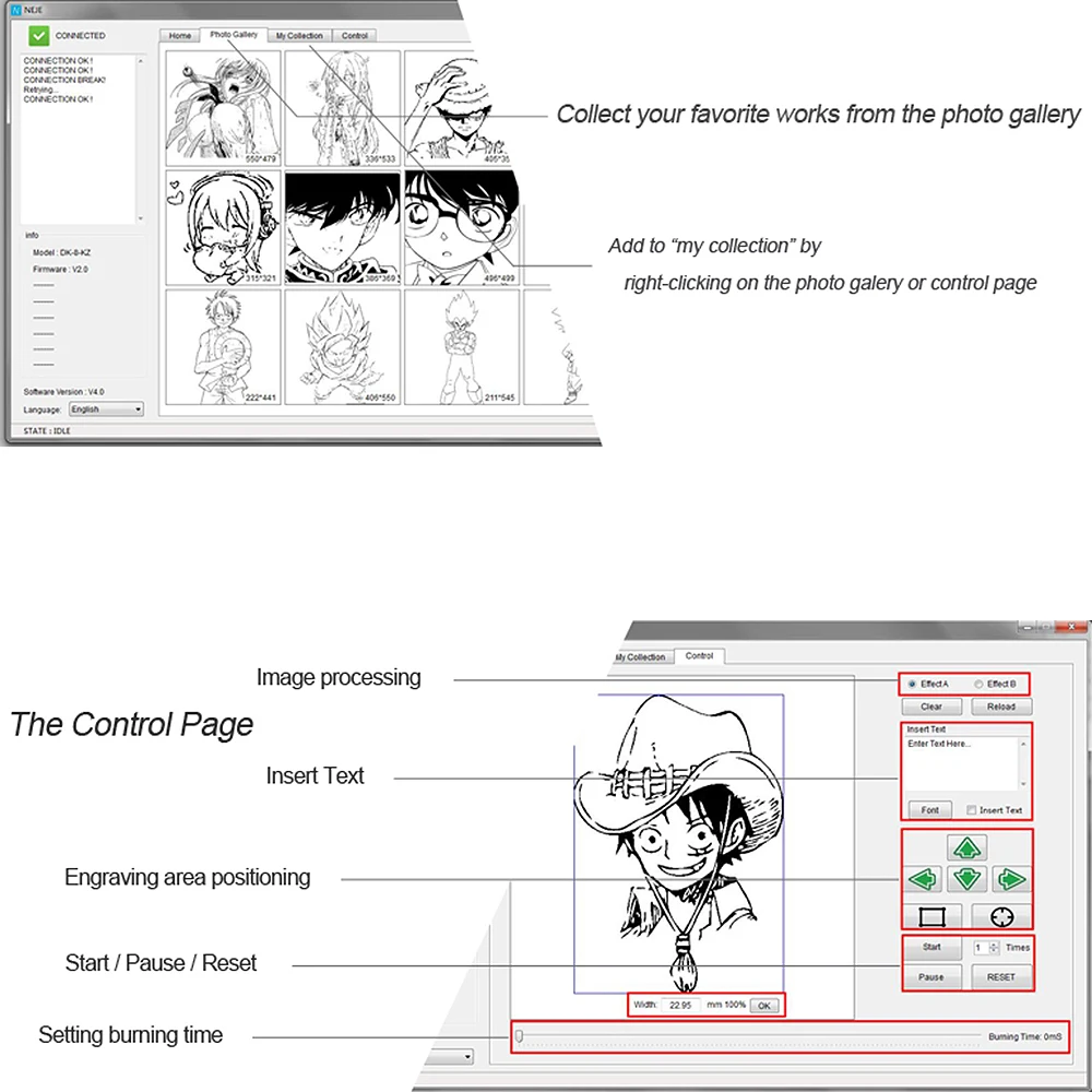 Сканируйте qr-код с помощью приложения NEJE Scanner (только поддержка версии Android), он автоматически подключается к компьютерному программному обеспечению, прост и прост в использовании.