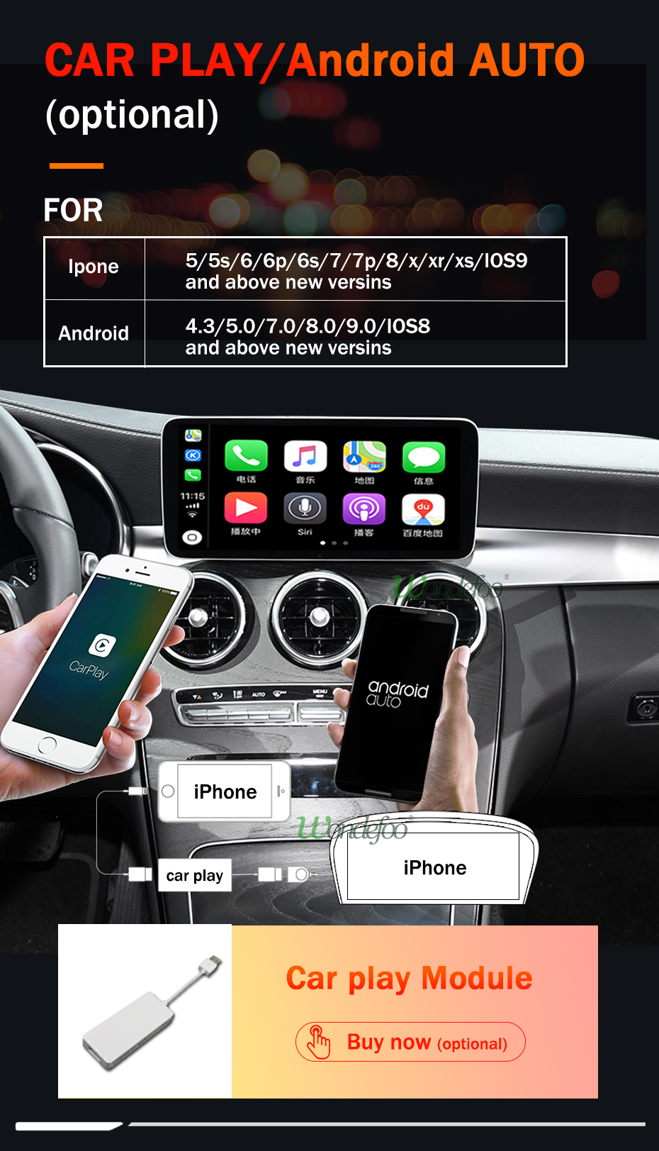 1. Android 10,0 RAM(4G / 2G/1G) ROM(64G / 32G/16G) Восьмиядерный/четырехъядерный IPS HD емкостной сенсорный экран. 2. Подарок = карта + дополнительный микрофон (Файл карты будет установлен на радио, карта не включена) 3. BT4.1 4. Поддержка воспроизведения видео 4K Ultra HD, H.264 (AVC), H.265 (HEVC) 5. 1 + 16G четырехъядерный 1024*600 2 + 32G четырехъядерный 1280*480 4 + 64G Восьмиядерный 1280*480 4 + 64G Восьмиядерный 1920*720P 6. Четырехъядерный процессор: MSM 8917 SNAPDRAGON 425 Восьмиядерный процессор: MSM 8953 SNAPDRAGON 625 7. Экран A-nti-g-lare опционально. 8. Это радио поддерживает внешний carplay (опционально) 9. Этот продукт совместим с сохранением всех особенностей оригинального автомобильного радио (CD). Поддержка оригинальной аудиосистемы Поддержка оригинальной автомобильной системы Поддержка оригинальной автомобильной камеры или автомобильного радара Поддержка оригинального радио и других Автомобильное радио для Mercedes Benz C Class W205 2015-2018 X253 W446 (NBT4.0/4,5/4,7/5,0/5,1/5,2)