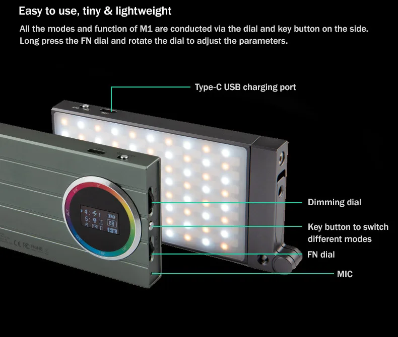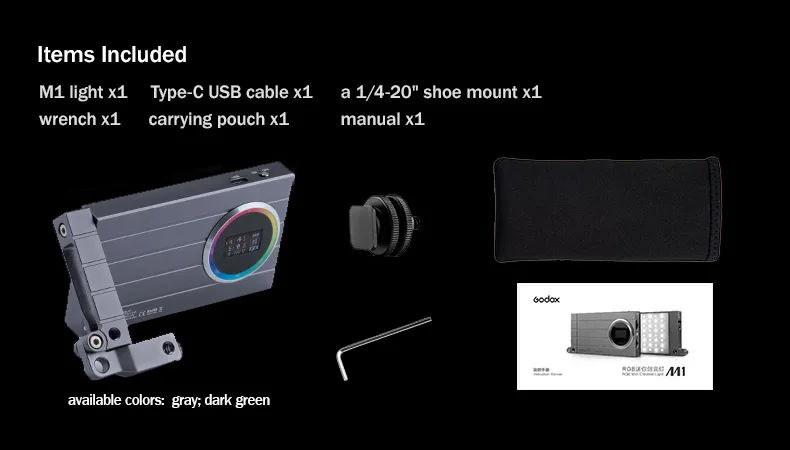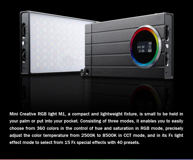 Godox M1 2500K-8500K полноцветный RGB светодиодный светильник Карманный алюминиевый сплав мини светодиодный видео креативный светильник несколько спецэффектов Особенности: Портативный и легко носить с собой весом 240 г и небольшим корпусом 145x70x15мм. Состоящий из 3 режимов, он позволяет легко выбрать из 360 цветов под контролем оттенка и насыщенности в режиме RGB, точно Отрегулируйте цветовую температуру от 2500Kto 8500K в режиме CCT, И выберите 15 режимов спецэффектов, нажав на кнопку FN. M1 fearure высокая цветопередача с CRI 97 и TLCI 97, представляя истинный и естественный цвет. M1 подходит для макросъемки, видеосъемки, прямой трансляции, портретной съемки и натюрморта и т. д. 15 FX спецэффектов Встроенный 14 видов эффектов, каждый эффект включает в себя 2-3 режима, 40 FX специальный светильник режимов эффекта в общей сложности. 15 наборов, как показано ниже: RGB цикл, вспышка, RGB, молния, сломанная лампа, телевизор, свеча Огонь, фейерверк, полицейский автомобиль, пожарная машина, скорая помощь, музыка, SOS