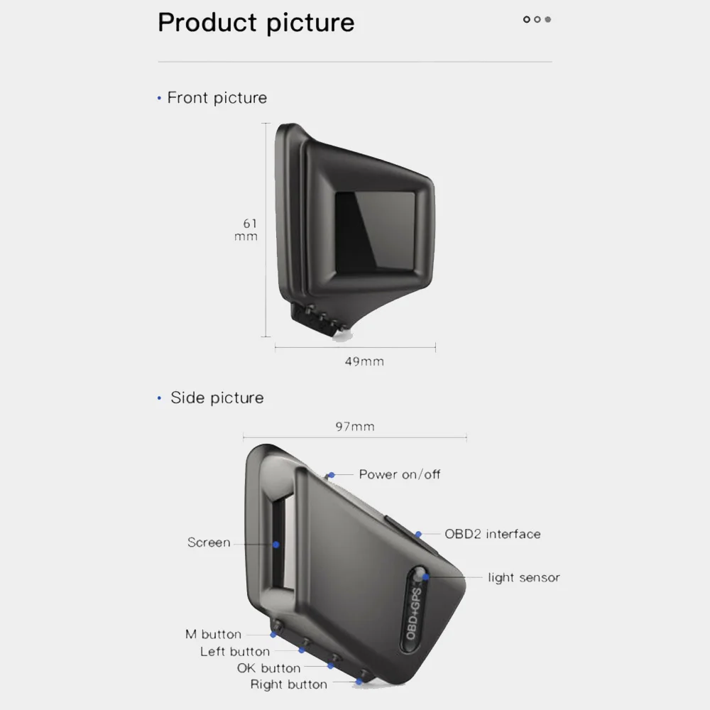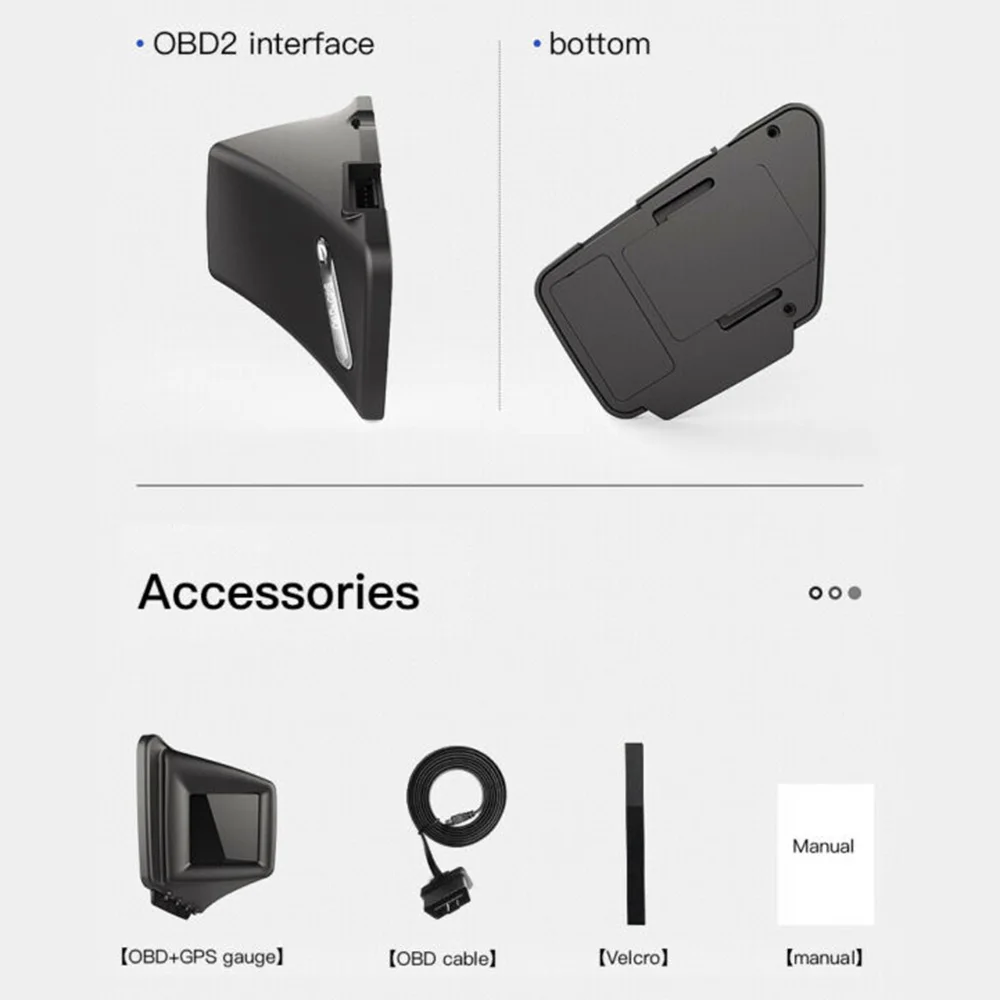 * Режим OBD2: скорость, скорость вращения, температура воды, напряжение, расход топлива, часы, одиночное расстояние вождения, одно время вождения, температура масла, давление турбины, испытание на ускорение, испытание на тормоз, сверхскоростная сигнализация, сигнализация неисправности двигателя, код устранения неисправностей, сигнализация температуры воды, сигнализация скорости вращения, сигнализация напряжения, Километровый переключатель, напоминание о усталости вождения, автоматический и ручной уровень яркости.
