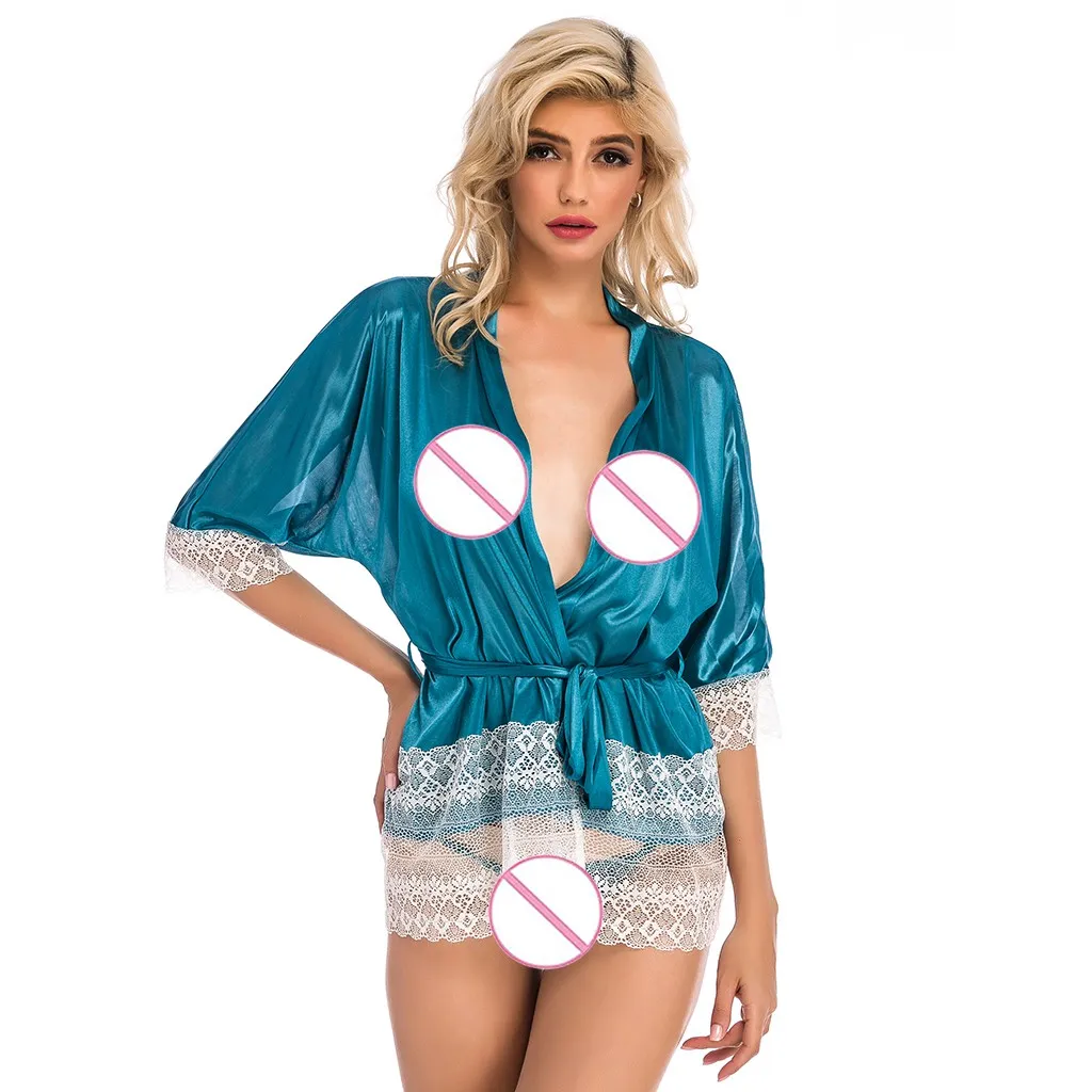 Синий женский сексуальный халат шелковое ночное белье Прозрачное нижнее белье стринги Набор Пижама Банный халат пижама, сексуальное нижнее белье Ночная рубашка