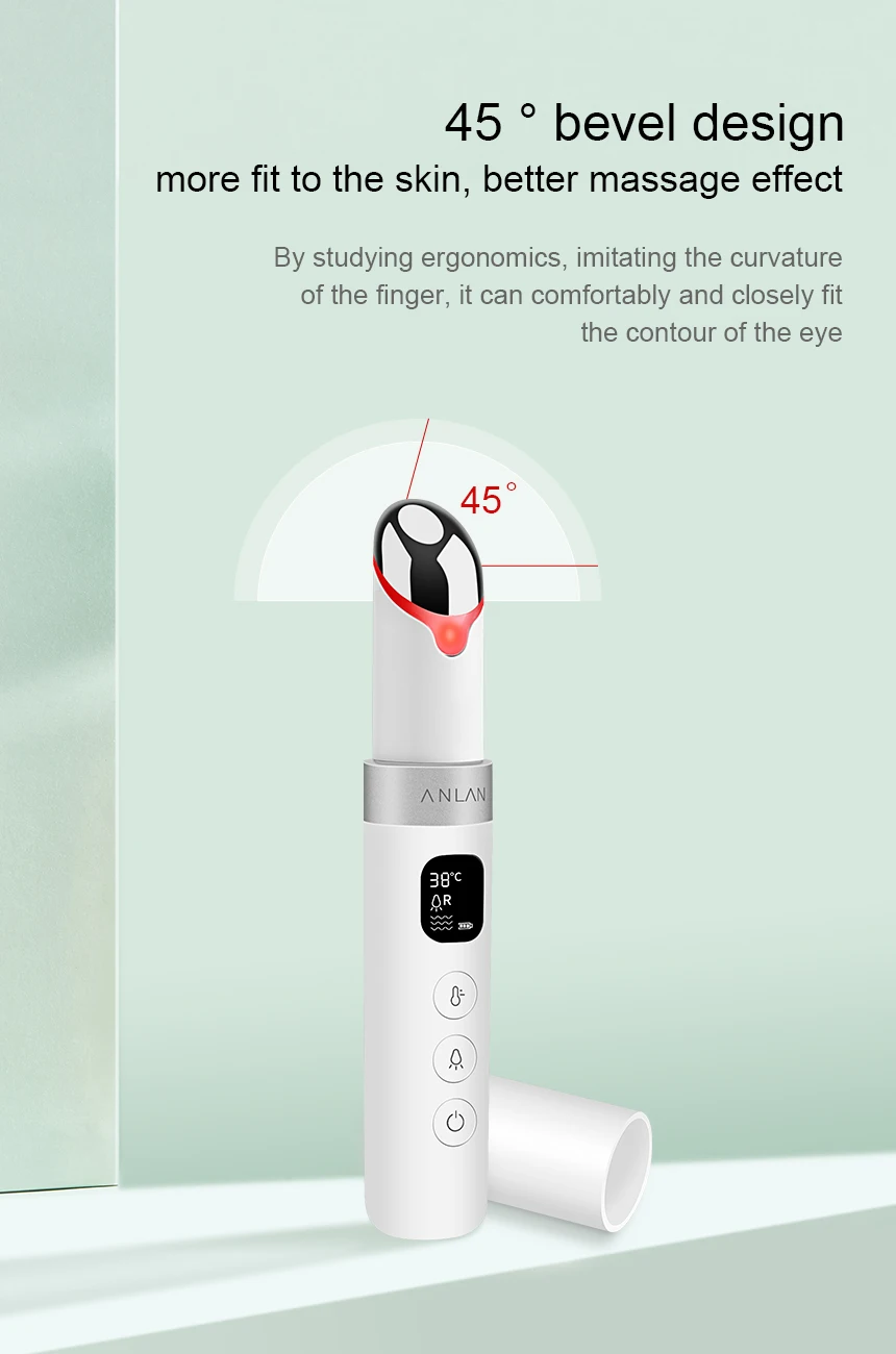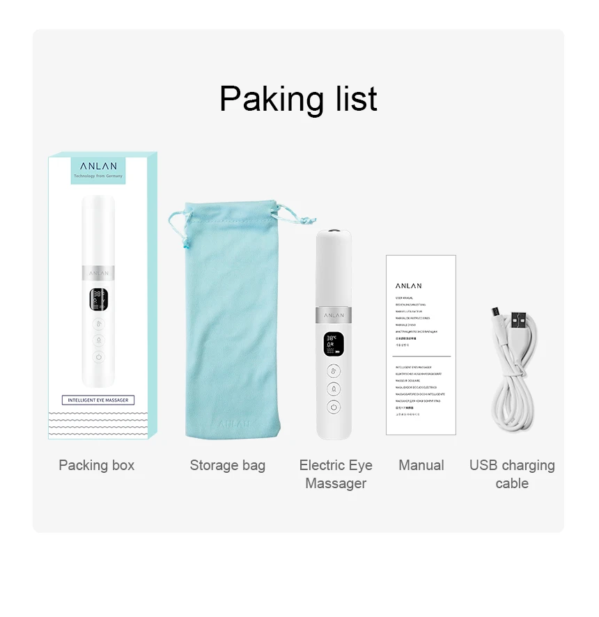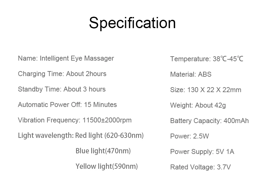 Название: Интеллектуальный массажер для глаз Материал: АБС-пластик Размер: 130X22X22 мм Вес около: 42 г Емкость аккумулятора: 400 мАч Мощность: 2,5 W Питание: 5V 1A Номинальная Напряжение: 3,7 V Время зарядки: около 2 часов Время работы в режиме ожидания: около 3 часов Автоматическое выключение: 15 минут Частота вибрации: 11500 ± 2000 об/мин Температура: 38 ℃-45 ℃ Светильник Длина волны лазера: Красный светильник (620-630nm), синий светильник (470nm), желтый светильник (590nm)