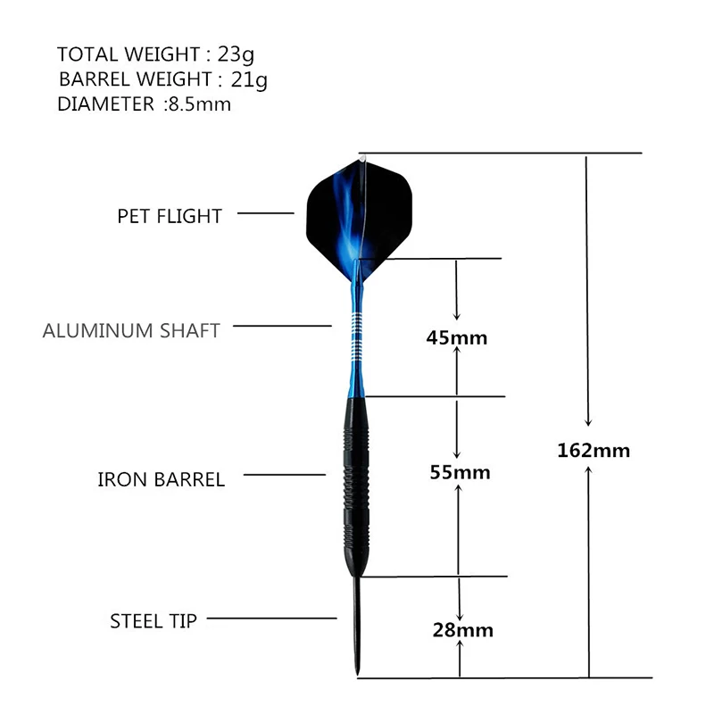 1. Название продукта: Набор для Дартс из 6 предметов 2. Количество Дартс: 6 шт. (3 синих Дарта + 3 красных Дарта) 3. Аксессуары: 1 шлифовальный камень 4. Цвет Дартс: синий, красный 5. Материал полета: ПЭТ 6. Материал вала: алюминий 7. Материал бочки: железо 8. Материал наконечника: Вольфрамовая сталь 9. Длина каждой Дротика: 162 мм 10. Вес каждой Дротика: 23 г 11. Вес каждого ствола: 21 г 12. Баррель Диаметр: 8,5 мм 13. Размер посылка: 17*11*3,5 см