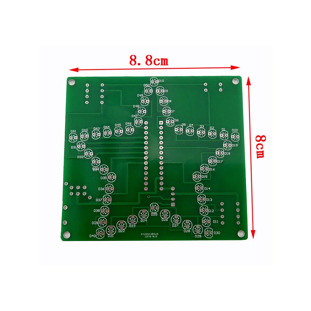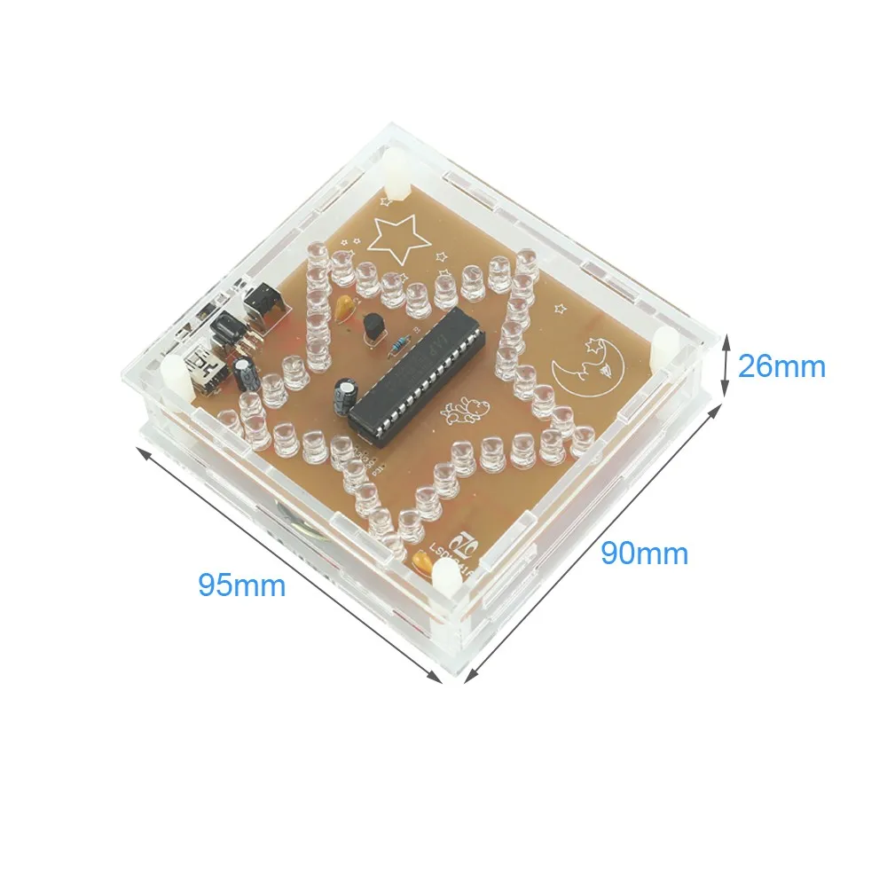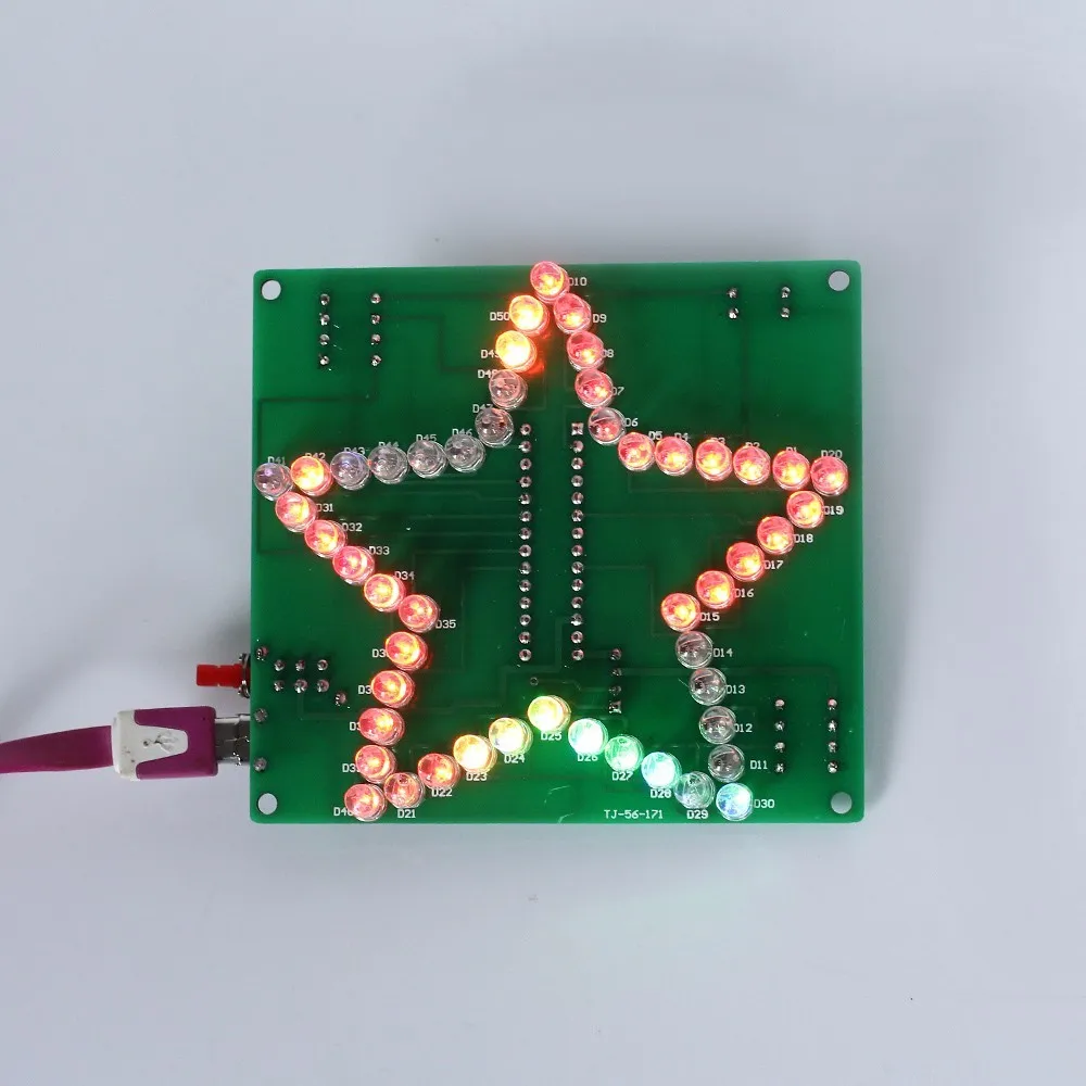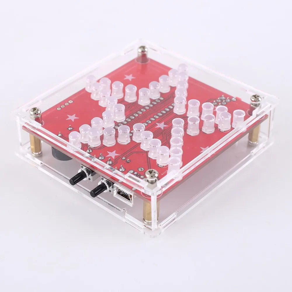 1.Introduction: It is a RGB LED pentagram DIY kit that you need to weld and assemble by yourself. The bottom plate comprises a circuit board and component parts. A variety of cool model showing a three-dimensional effect. It's better to watch in the night. The chip has its own voice file. Users can also insert the TF card and play the voice file inside the TF card. 2.Feature: 1>.Built-in voice file 2>.Built-in amplifier 3>.Support TF card 4>.Acrylic transparent shell 5>.RGB LED light color changes automatically 3.Parameter: 1>.Work Voltage:DC 5V 2>.Work Current:130mA 3>.Speaker:2W 8ohm 4>.Support TF card:32G(Max) 5>.Support music format:MAV 6>.Work Temperature:-40℃~85℃ 7>.Work Humidity:0%~95%RH 8>.Size(Installed):60*45*12mm 4.Application: 1>.Training welding skills 2>.Student school 3>.DIY production 4>.Project Design 5>.Electronic competition 6>.Gift giving 7>.Crafts collection 8>.Home decoration 9>.Souvenir collection 5.Installation Tips: 1>.User needs to prepare the welding tool at first. 2>.Please be patient until the installation is complete. 3>.The package is DIY kit.It need finish install by user. 4>.The soldering iron can't touch the components for a long time(1.0 second), otherwise it will damage the components. 5>.Pay attention to the positive and negative of the components. 6>.Strictly prohibit short circuit. 7>.Users can complete installation by PCB silk screen and component listing. 8>.User must install the LED according to the specified rules.Otherwise some LED will not light. 9>.Install complex components preferentially. 10>.Make sure all components are in right direction and right place. 11>.It is strongly recommended to read the installation manual before starting installation. 6.Installation Steps: Step 1: Install 1pcs 470ohm 1/6W metal film resistor at R1. Step 2: Install 1pcs Mini USB Socket at USB1. Step 3: Install 1pcs Toggle Switch at S1. Step 4: Install 1pcs DIP-28 IC Socket at U1.Pay attention to the installation direction. Step 5: Install 1pcs SOT-223 AMS1117 Voltage Converter at VR1.Note:It is mounted on the red side of the PCB. Step 6: Install 1pcs SMD TF Card Socket at M1.Note:It is mounted on the red side of the PCB. Step 7: Install 2pcs 0.1uf Monolithic Capacitor at C3 and C4. Step 8: Install 1pcs Black Button at S2. Step 9 Install 1pcs TO-92 Transistor S8050 at Q1. Step 10: Install 2pcs 100uf 16V electrolytic capacitor at C1 and C2.Pay attention to the positive and negative of the components.The longer pin is positive pin. Step 11: Install 40pcs 5mm RGB LED at D1~D40.Pay attention to the positive and negative of the components.The longer pin is positive pin. Step 12: Install 1pcs DIP-28 IAP15W413AS at U1 on IC socket.Pay attention to the installation direction. Step 13: Install 1pcs Infrared Receiver at M2.Please note whether the kit user purchased includes a remote control. User do not need to install Infrared Receiver if kits do not include a remote control. Step 14: Connect two cables on speaker.Pay attention to the positive and negative. Step 15: Connect 2W 8ohm speaker at LS1 on the red side of the PCB. Step 16: Remove the adhesive from the speaker and attach the speaker to the back of the PCB. Step 17: Install 8pcs M3*10+6mm Plastic Screw Post on PCB. Step 18: Remove the protective film from the acrylic surface. Step 19: Install the acrylic case. Step 20: Test and Application.