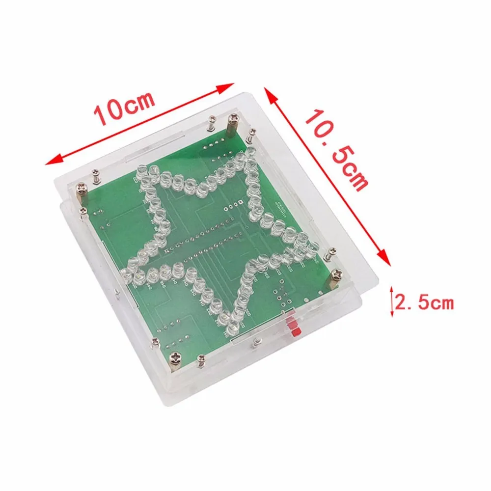 Pentagram RGB LED Music Controller DIY Kit 1.Introduction: This is a RGB LED pentagram DIY kit that you need to weld and assemble by yourself. The bottom plate comprises a circuit board and component parts. A variety of cool model showing a three-dimensional effect. It's better to watch in the night. 2.Parameter: 1>.Work Voltage:DC 3.5V-5.5V 2>.Work Current:100mA 3>.Power Type:MINI USB 4>.Control Type:Button Control 5>.Music Type:Pure Music 6>.Music: 11kinds(Can not be modified) 7>.Work Temperature:-40℃~85℃ 8>.Work Humidity:0%~95%RH 3.Function: 1>.RGB LED light color changes automatically 2>.Automatic music playback 3>.11kinds pure music 4>.Switch memory function 5>.Music switch control 6>.MINI USB provide power supply 7>.Perfect simple circuit 4.Application: 1>.Training welding skills 2>.Student school 3>.DIY production 4>.Project Design 5>.Electronic competition 6>.Gift giving 7>.Crafts collection 8>.Home decoration 9>.Souvenir collection 5.Installation Notes 1>.User needs to prepare the welding tool at first. 2>.This DIY installation is more difficult to be installed, please be patient until the installation is complete. 3>.The package is DIY kit.It need finish install by user. 4>.The soldering iron can't touch the components for a long time(1.0 second), otherwise it will damage the components. 5>.Pay attention to the positive and negative of the components. 6>.Users can complete installation by PCB silk screen and component listing. 7>.User must install the LED according to the specified rules.Otherwise some LED will not light. 8>.Install complex components preferentially. 9>.Make sure all components are in right direction and right place. 10>.It is strongly recommended to read the installation manual before starting installation.