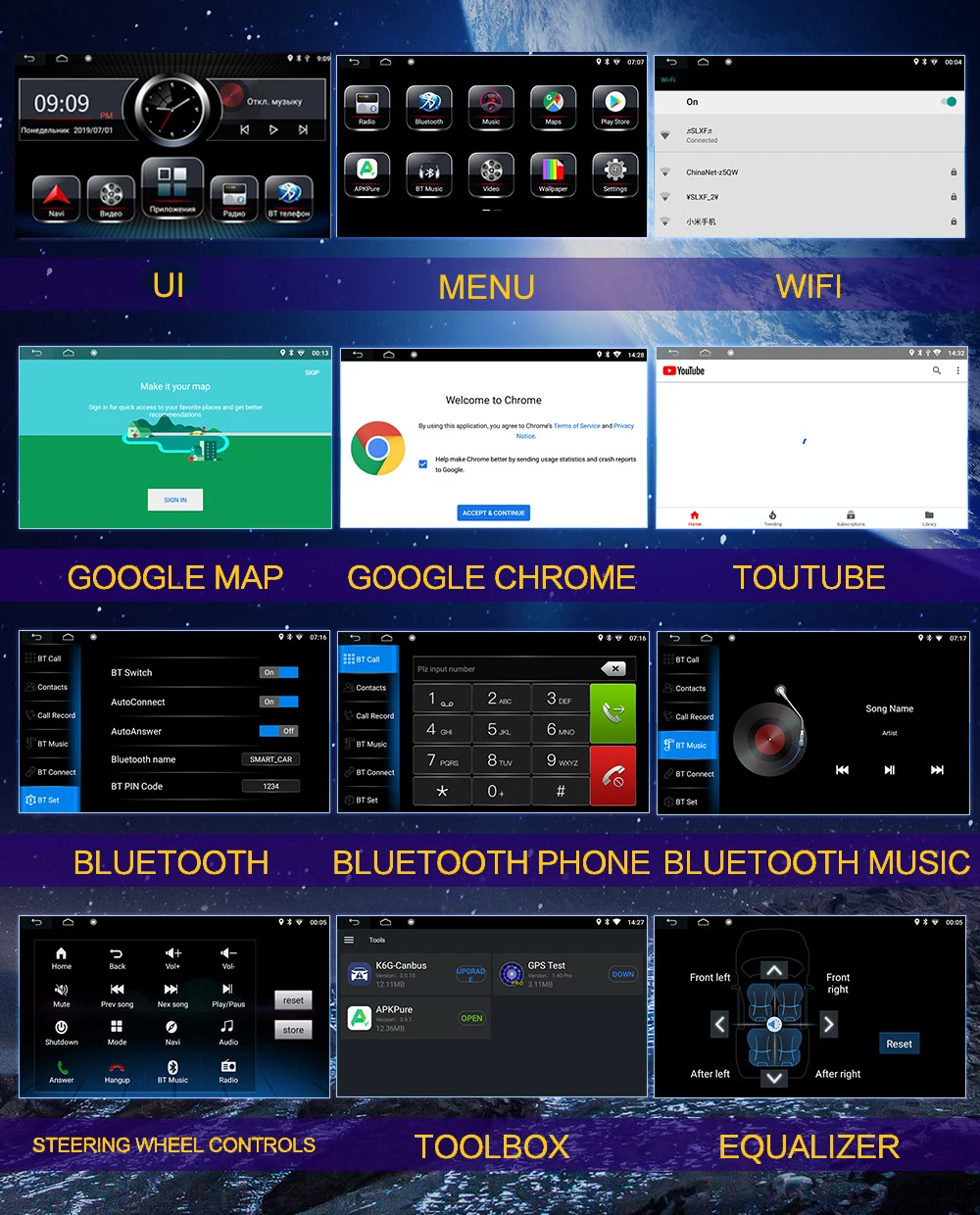 1. Конфигурация ЦП: MT6580 A7 Графический процессор: ARM Mali-T400 MP2 RAM + ROM: 2 ГБ + 16 ГБ/2 ГБ + 32 ГБ/2 ГБ + 64 ГБ Процессор: 4-ядерный процессор с одним ядром, скорость до 1,3 ГГц Разрешение экрана: 1024*600 Система: Android 8,1 Усилитель IC: TDA7388 Радио IC: 4732 (FM/AM/RDS) 2. Конфигурация Выход видео: добавить видеомодуль (опционально) Аудиоформат: MP3/MP2/WAV/WMA/AAC/AMR/FLAC/M4A/OGG // APE (без потерь) Формат видео: 3G2/ASF/AVI/DivX/mkv/MOV/MP4/MPG/TS/WMV/VOB/WEBM/M4V RMVB/FLV/H.264 /H.265 Обновление системы: онлайн-обновление, локальный U-диск/TF-карта Функция Bluetooth: телефон с громкой связью Bluetooth (HFP), музыка Bluetooth (A2DP), синхронизация телефонной книги и История звонков Мобильный Интернет: Yilian (Android/IOS) 3. Конфигурация Встроенные приложения: Google Maps, Play Store, APK Pure, YouTube Язык: китайский/традиционный китайский/английский/Болгария/Корейский/арабский/испанский/португальский/русский/ Вьетнам/Иврит/Польша/Индонезия/Румыния/тайский/Тагальский/Украина Сигнал камеры: CVBS, AHD 720P, TVI, CVI, PVI, AHD 1080P Вход AV: Видео: 1-канальный вход сигнала CVBS, аудио: 2 канала аудиосигнала (L in + R in) Выход AV: выход аудиосигнала (низкочастотный динамик L out + R out + SUB) Управление рулевым колесом: ключ 1/ключ 2 CAN BUS: CAN H, CAN L Рабочая температура: -20 °C ~ + 70 °C Температура хранения: -40 °C ~ + 85 °C Диапазон рабочего напряжения: 9,6 В ~ 16 В постоянного тока Ток в режиме ожидания всего устройства: Выкл. ACC: ≤ 5 мА Зарядка через USB-выход: зарядный ток до 1,0 А (выход 5 В, 1,0 А)