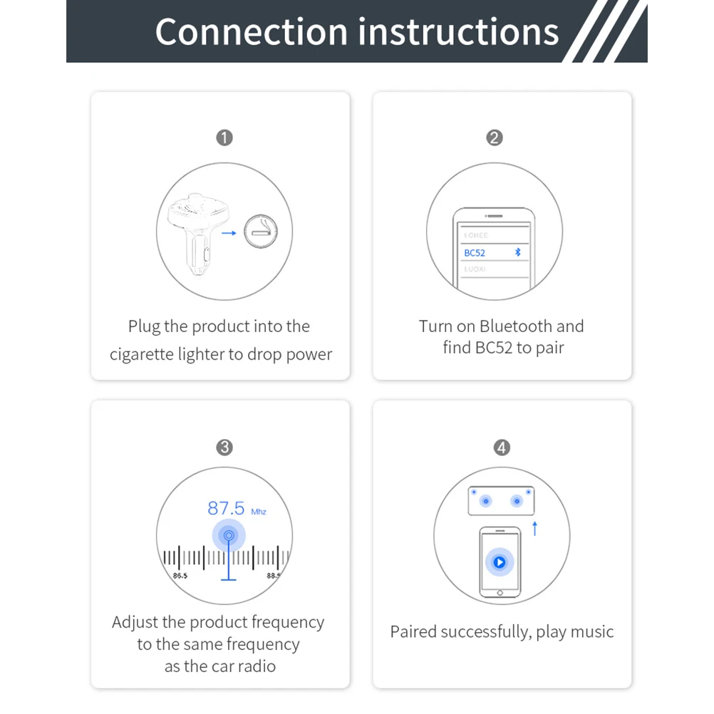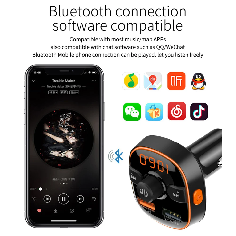 Этот FM модулятор может быть применен к 12V-24Vmainstream транспортным средствам на рынке. Также совместим с большинством приложений для музыки/карт, Wechat и т. д.