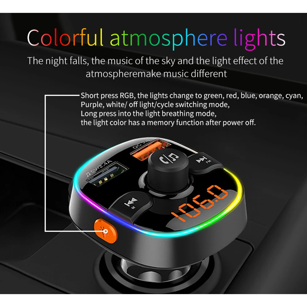 Этот автомобильный Bluetooth fm-передатчик поддерживает звонки без рук, голосовую навигацию, bluetooth MP3-плеер, музыкальный красочный светильник и т. д.