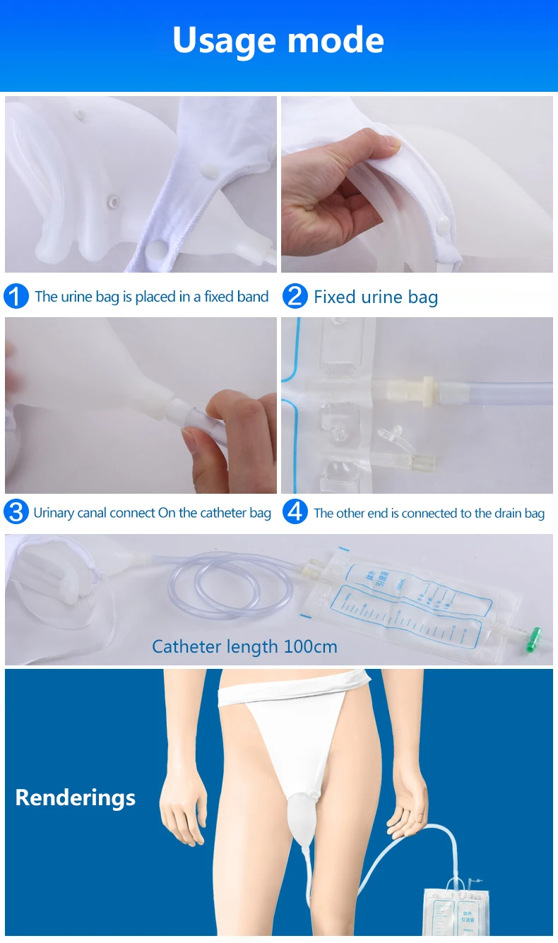 1. Пожалуйста, откройте мешок с мочой водой или воздухом, чтобы предотвратить соединение мешка. Если катетер разгладится, пожалуйста, запечатайте его с помощью теплой воды. 2. Завяжите пояс на талии и прикрепите треугольную ткань к животу. Затем поместите уретру в воронку писсуара. 3. Пожалуйста, подключите две длинные полосы треугольной ткани к поясу. Включите выхлоп на сумке для мочи и Повесьте мешок для мочи на кровати, затем подключите катетер к сумке для мочи.