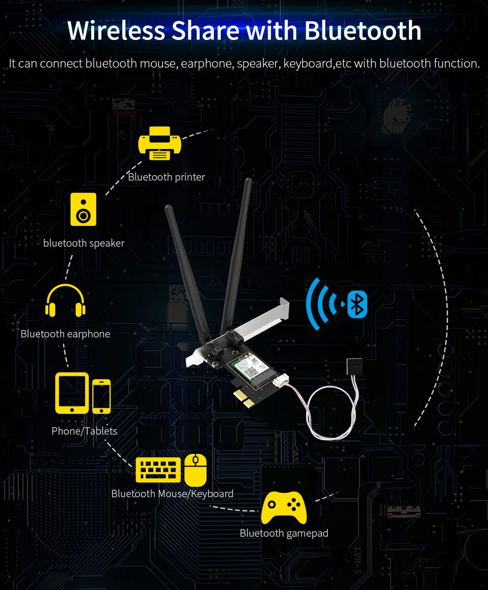 Hardware:Intel AX200NGWAntenna: External 2 * 5dBiWireless rate: 2.4G +5GInterface:PCIE-16X…, Graphic card slotTransmission power: WiFi: 19.5dBm(maximum) BT: 10dBmOther functions: Soft AP Wi-Fi transferring; needs third party software on Win10Suits for : Desktop (Except Mac)Support OS : Win10(64bit) Bluetooth 5.1![]()