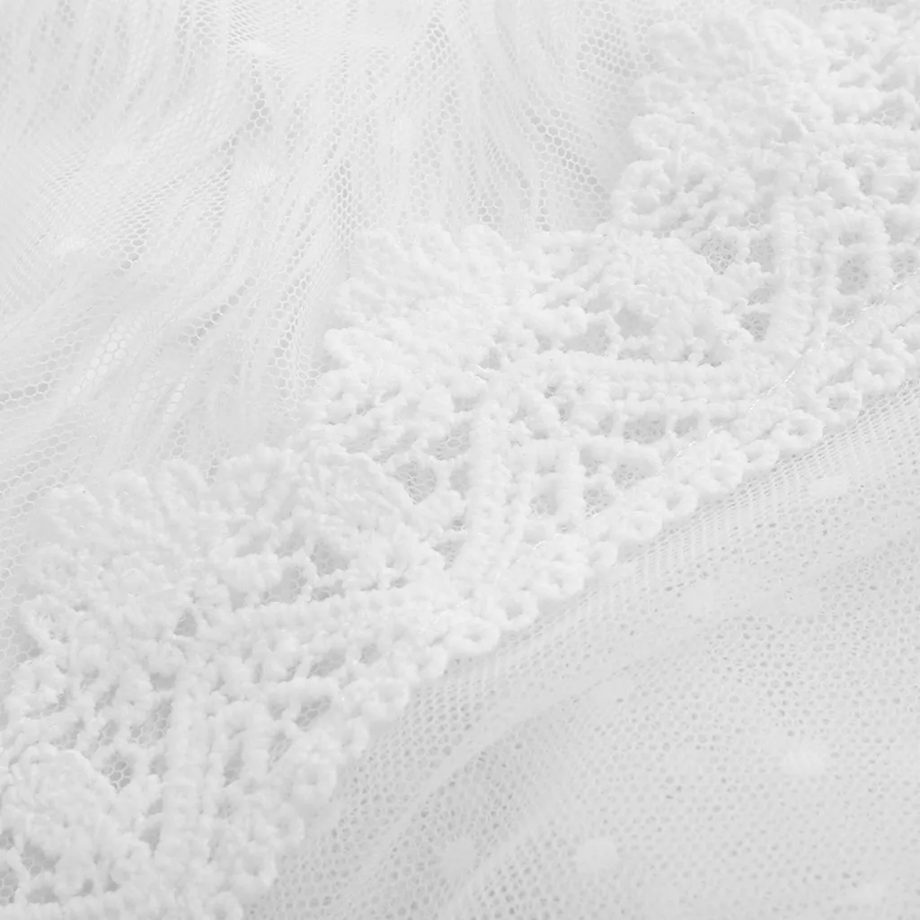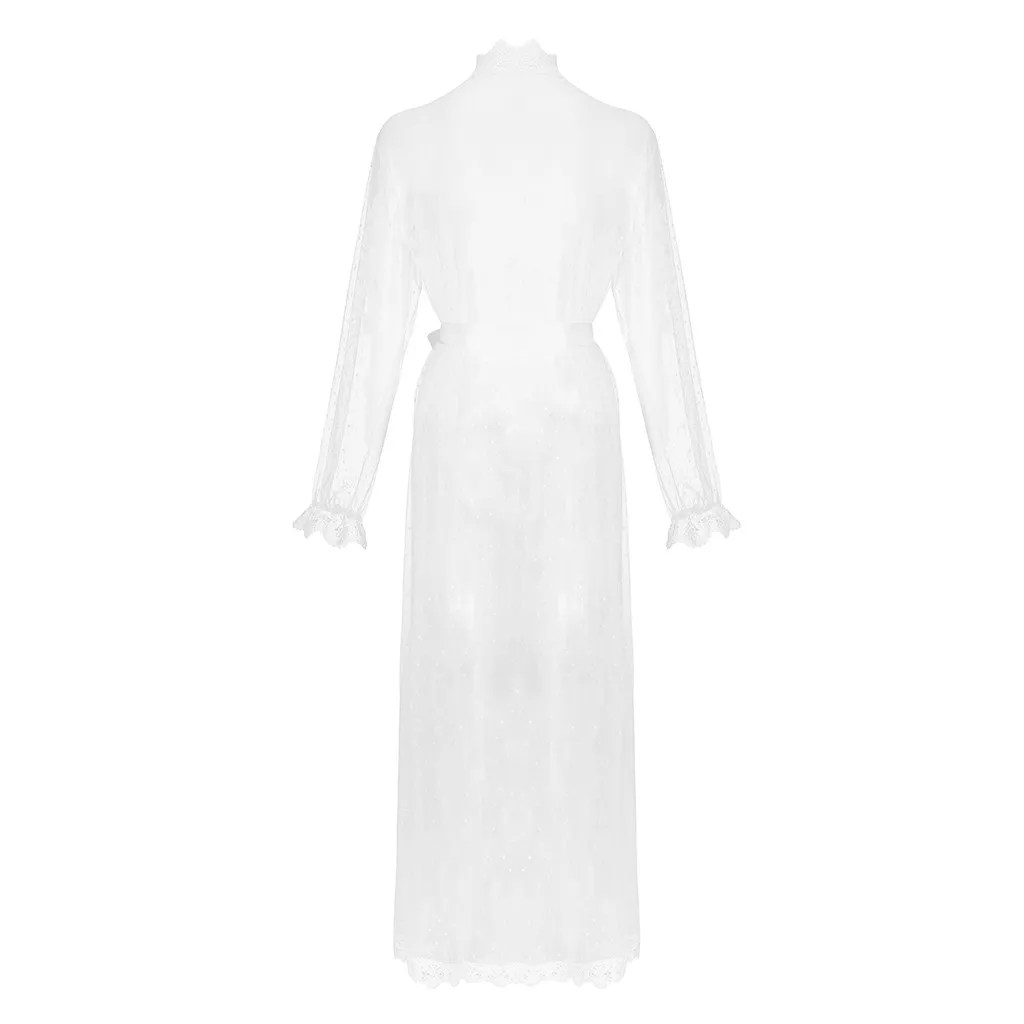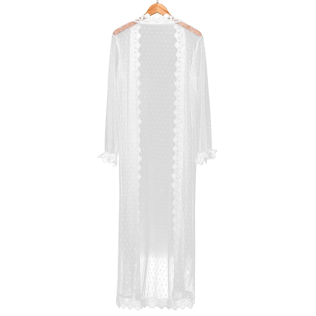Это длинное платье в основном изготовлено из марли в горошек и украшено кружевом.