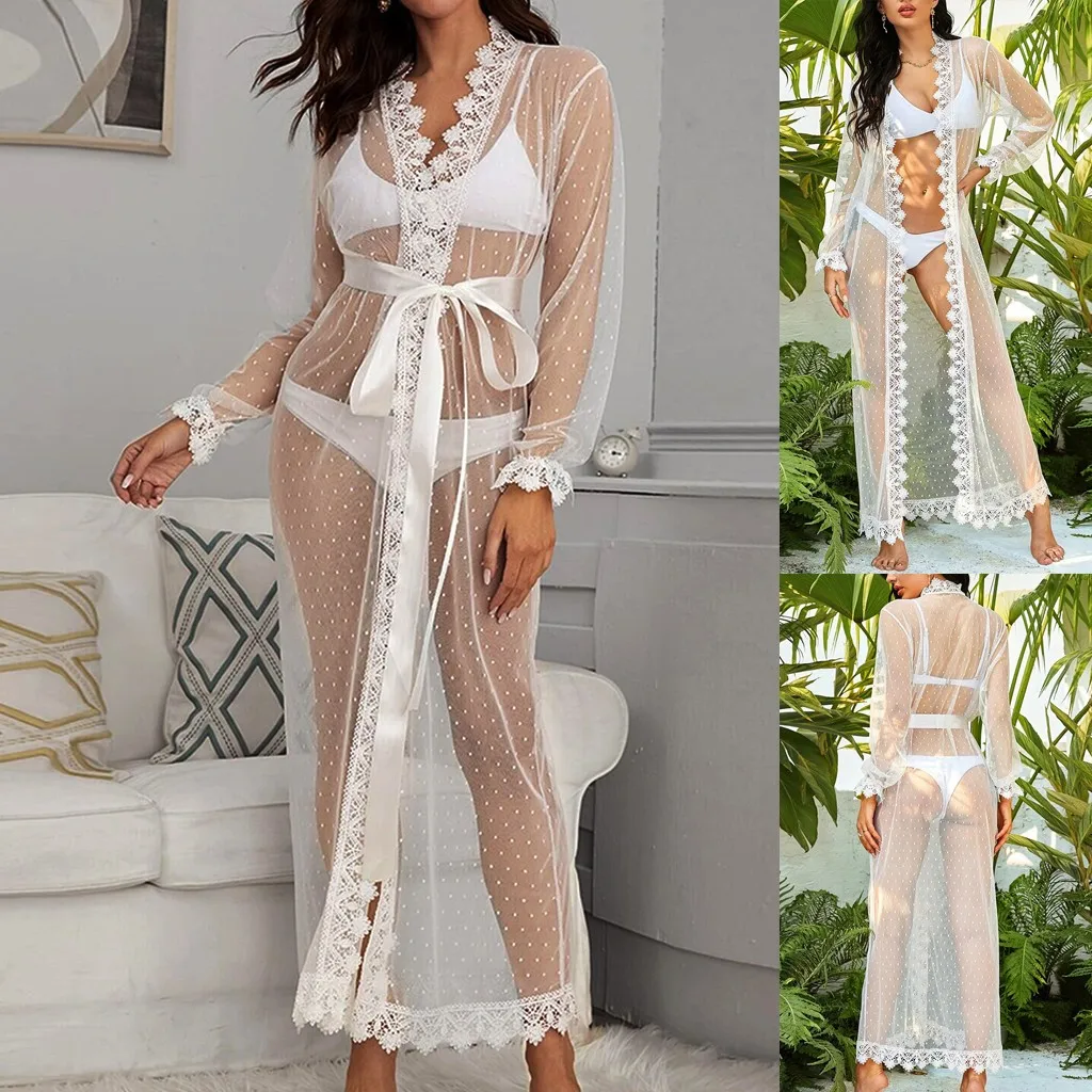 Новинка, женское сексуальное платье в горошек с контрастным кружевом, Сетчатое платье с поясом, бикини, блуза, Пляжное Платье
