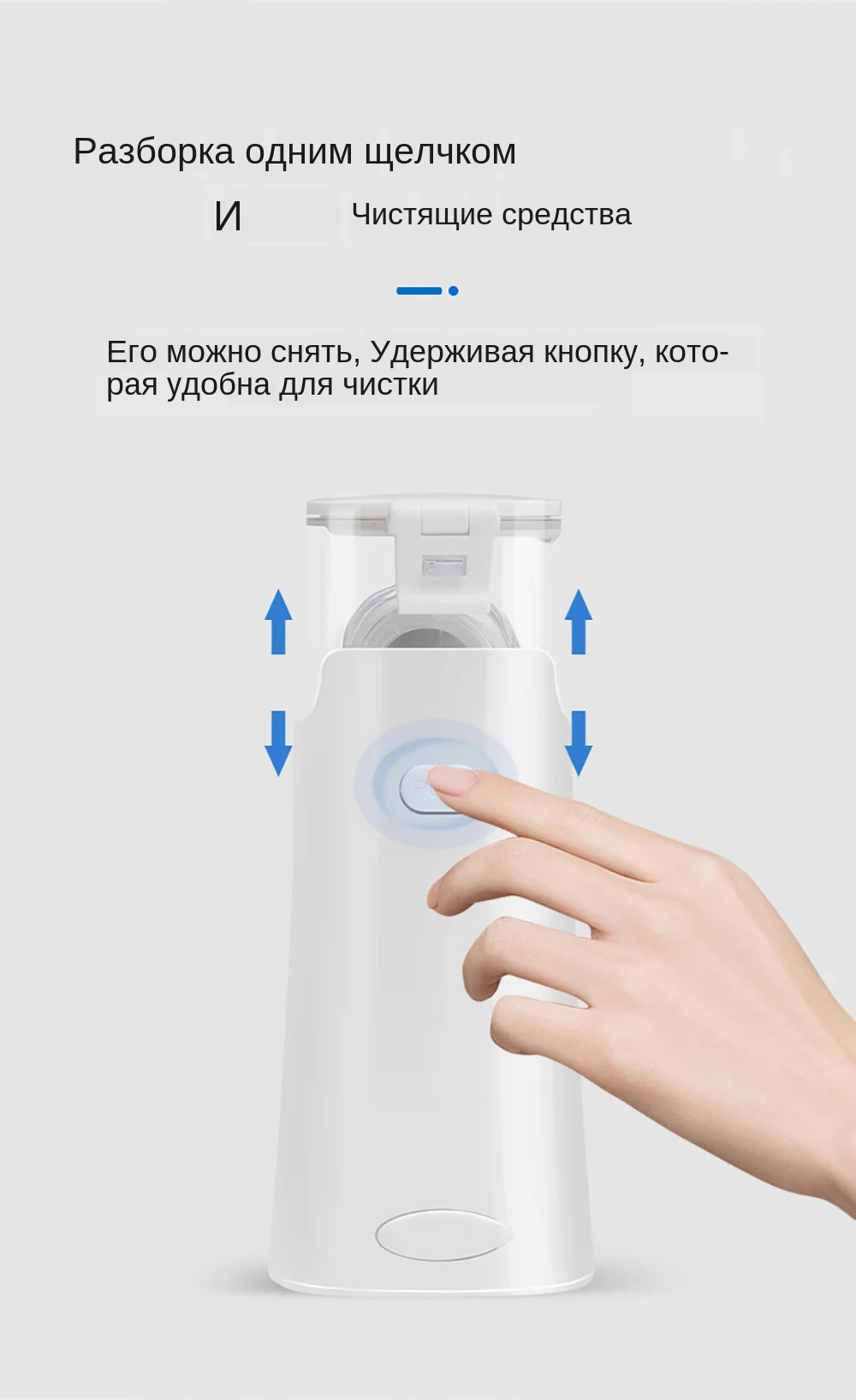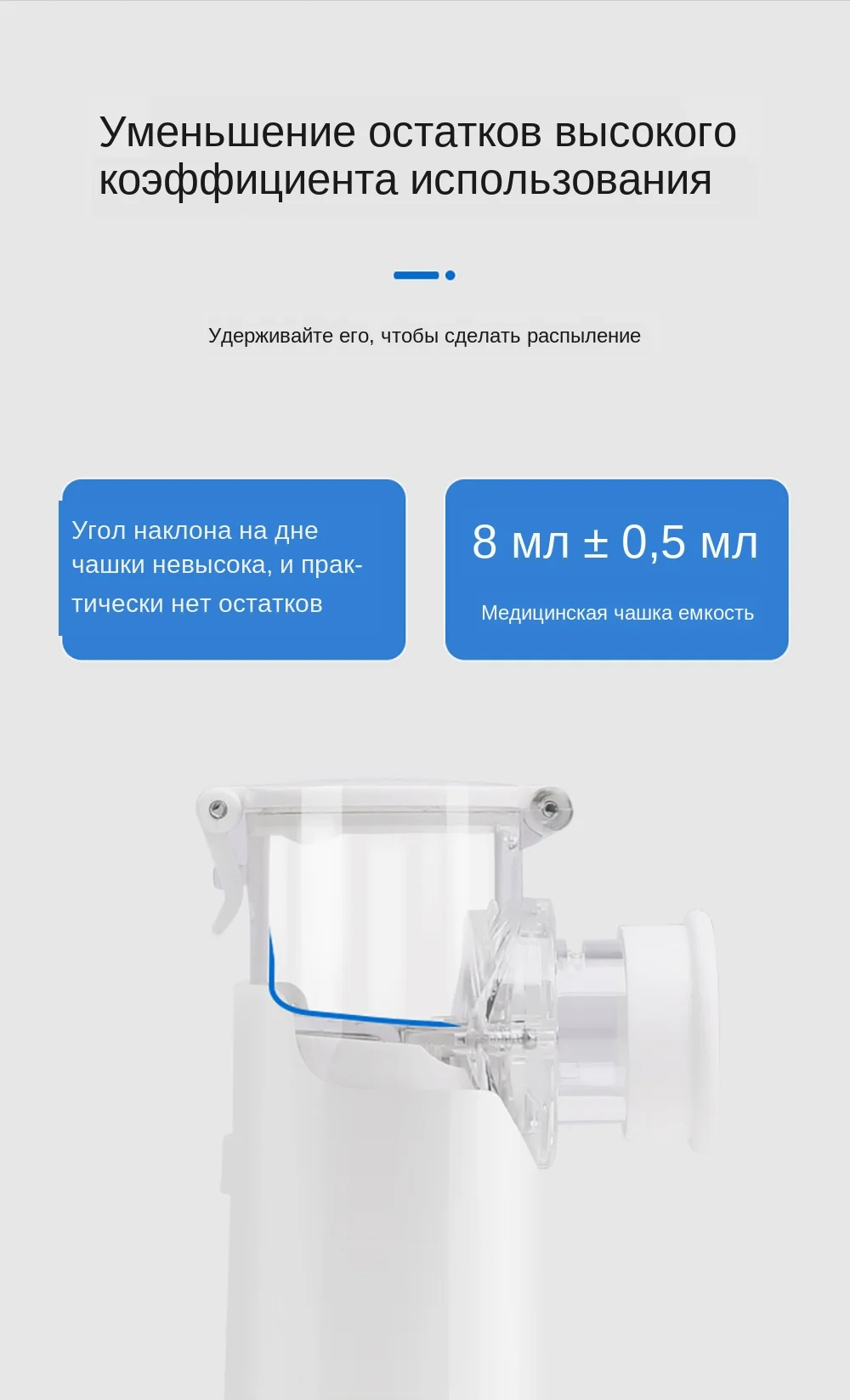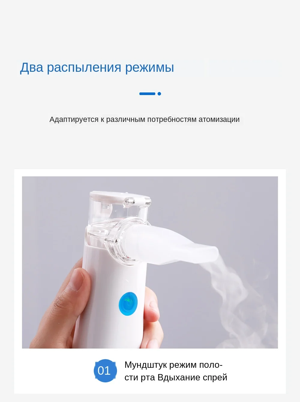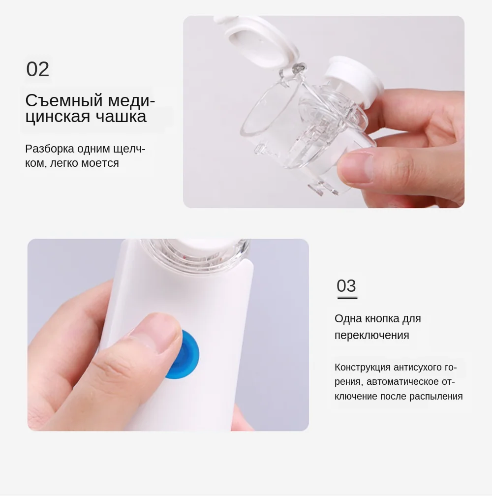 1. Подходит для взрослых и детей 2. Микроновые частицы, легко впитывают 3. Простой и удобный кнопочный переключатель 4. Измеренный объем не выше 50 дБ, по сравнению с традиционными Раздражающий шум медицинского компрессионного распылителя, только тонкий туман, может даже распылять спящего ребенка 5. Высокая степень использования. Угол скоса в нижней части чашки низкий, и есть небольшие остатки 6. Мелкие частицы более эффективно всасываются. Пьезоэлектрический сетчатый атомайзер, распыленные частицы могут покрывать верхние дыхательные пути, трехеа, бронхи, альвеоли и напрямую достигать пораженных мест 7. Разборка и очистка одним кликом. Его можно снять, Удерживая кнопку нажатия, что удобно для чистки, Избегайте перекрестной инфекции и Защищайте здоровье детей 8.USB зарядка. Подходит для различных зарядных устройств