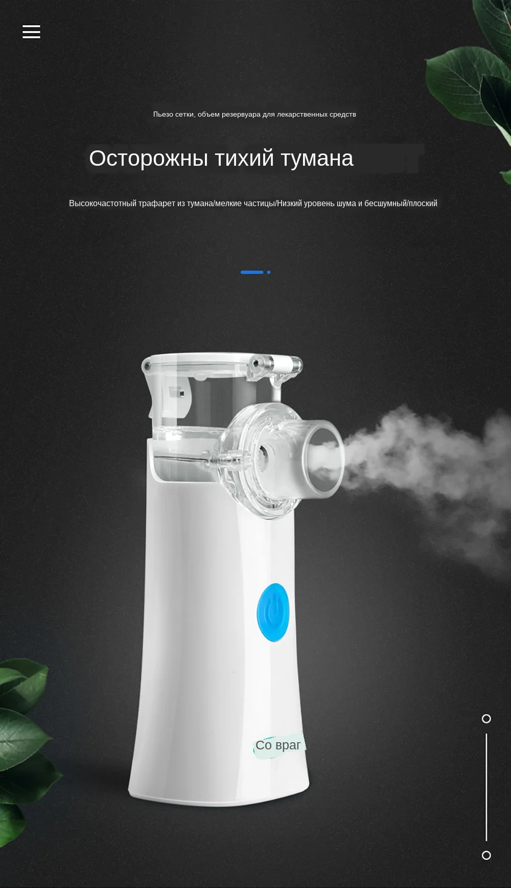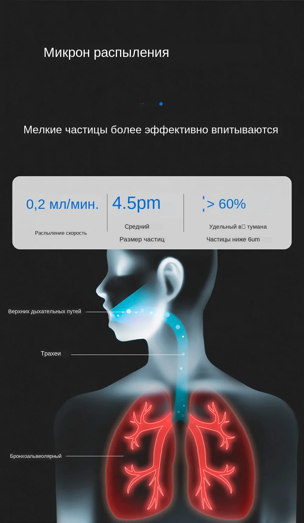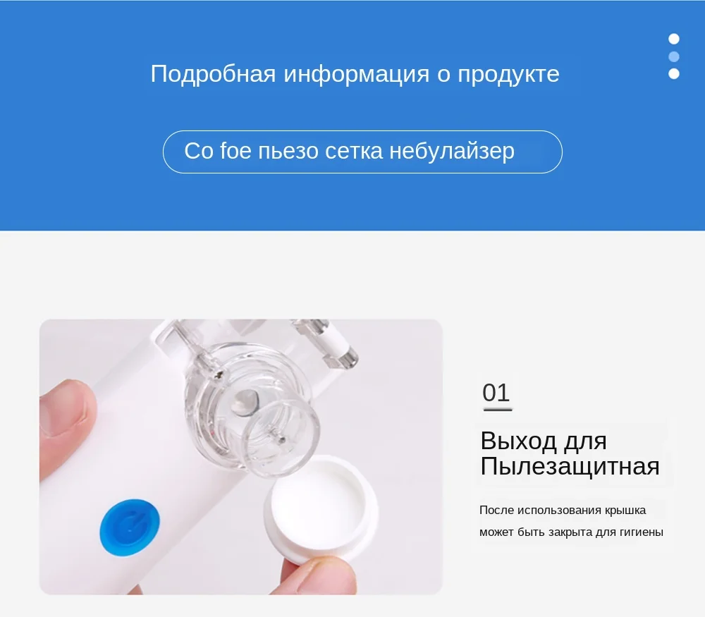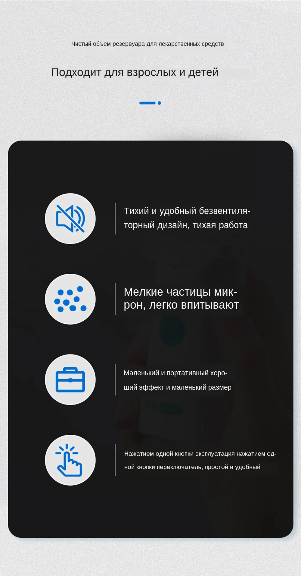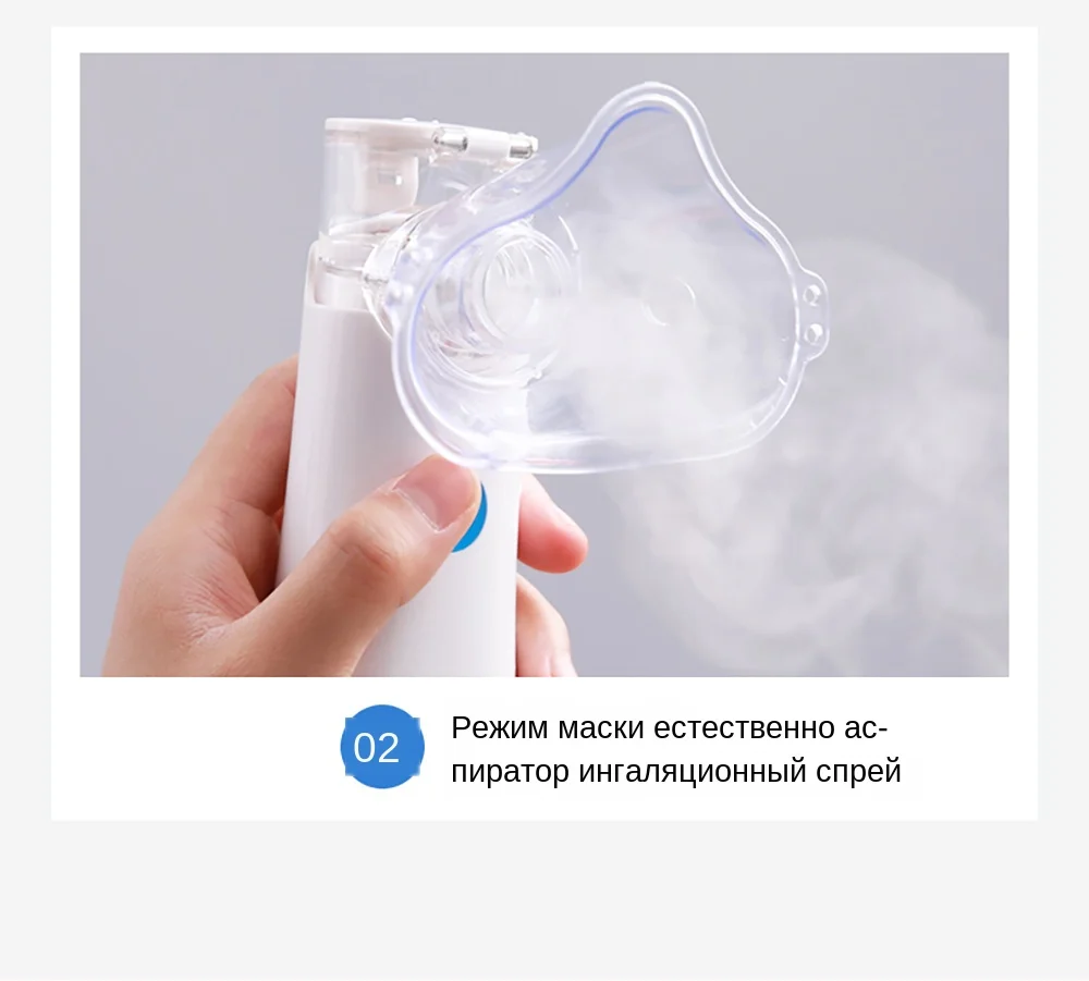 1. Подходит для взрослых и детей 2. Микроновые частицы, легко впитывают 3. Простой и удобный кнопочный переключатель 4. Измеренный объем не выше 50 дБ, по сравнению с традиционными Раздражающий шум медицинского компрессионного распылителя, только тонкий туман, может даже распылять спящего ребенка 5. Высокая степень использования. Угол скоса в нижней части чашки низкий, и есть небольшие остатки 6. Мелкие частицы более эффективно всасываются. Пьезоэлектрический сетчатый атомайзер, распыленные частицы могут покрывать верхние дыхательные пути, трехеа, бронхи, альвеоли и напрямую достигать пораженных мест 7. Разборка и очистка одним кликом. Его можно снять, Удерживая кнопку нажатия, что удобно для чистки, Избегайте перекрестной инфекции и Защищайте здоровье детей 8.USB зарядка. Подходит для различных зарядных устройств