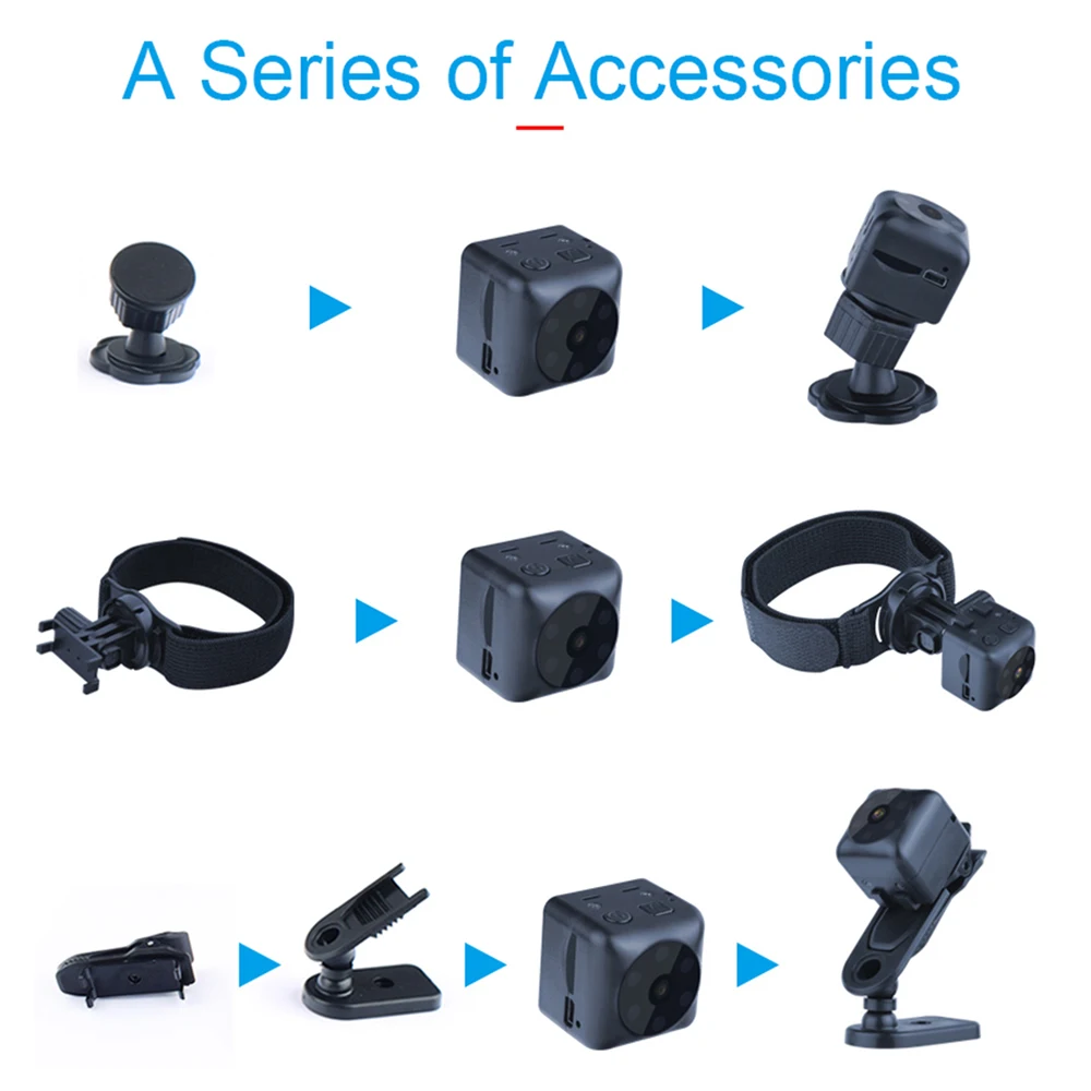 Технические характеристики: Частота кадров видео: ~ 30 кадров в секунду Интерфейс: Micro-USB Память: поддержка tf-карты 8-32 Гб Напряжение: DC-5V 1A Разрешение видео: 1280*720 Батарея: ~ 180 мАч литиевая батарея Формат изображения: JPG Формат видео: AVI Описание: -Запись видео во время включения без пропуска в любое время; -Высокое качество изображения, четко смотрите каждую деталь; -Супер маленький и светильник, с повязкой на голову, которую можно носить с собой; -Конструкция Магнитного Всасывания, которая может быть установлена в любом скрытом уголке; -Инфракрасное ночное видение, которое можно запечатлеть днем и ночью; -Мобильное обнаружение, без каких-либо подозрительных фигур; -Круговая запись. Не беспокойтесь о том, что делать, когда карта памяти заполнена. Вспомогательное оборудование: 1. Камера 2. Кронштейн 3. Спортивная одежда с галстуком 4. Кабель для передачи данных 5. Задний зажим 6. Основание 7. Разъем 8. Наперсток 9. Руководство пользователя
