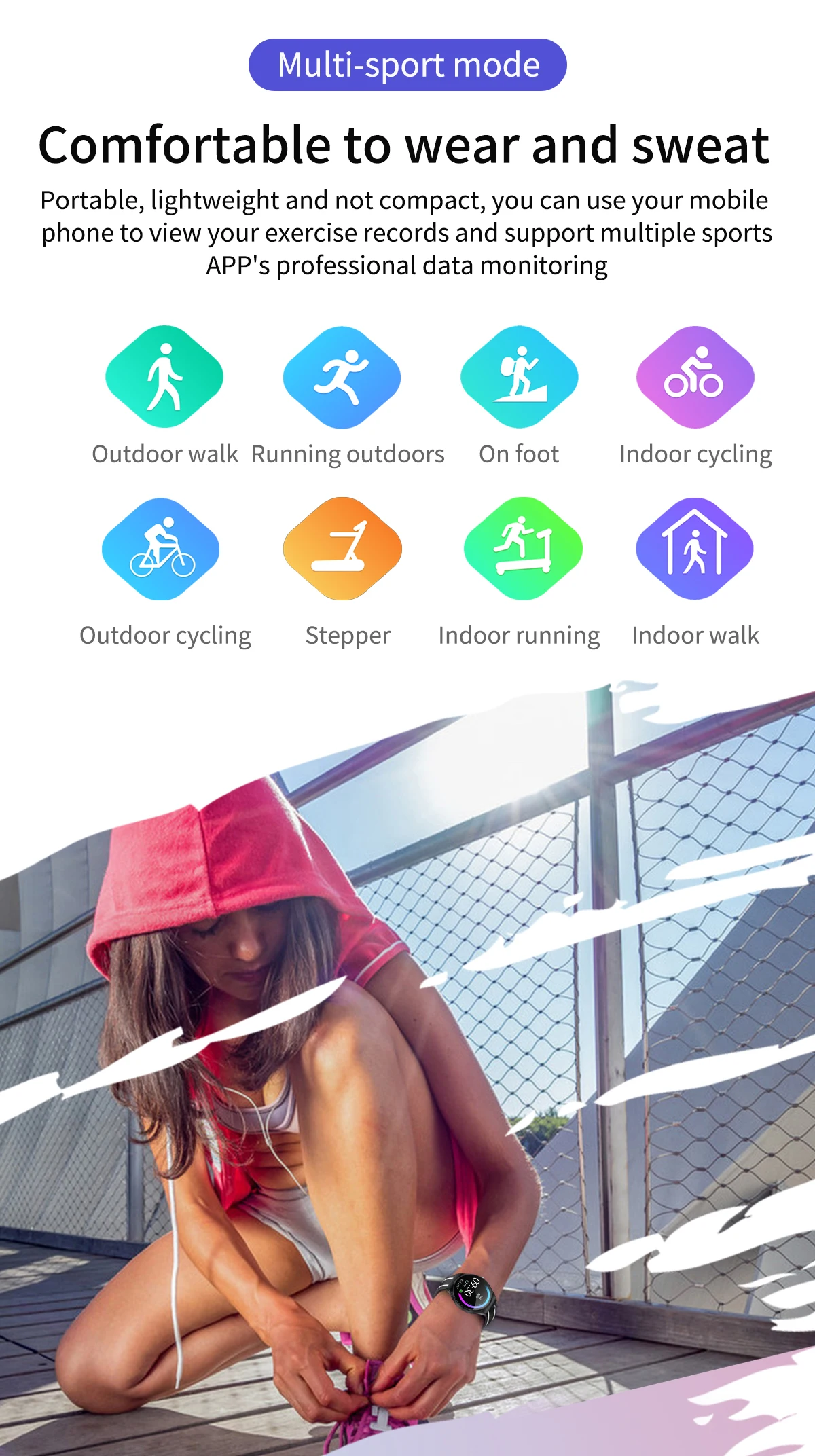 Удобно носить и переносить пот, легкий и не компактный, вы можете использовать свой мобильный телефон для просмотра записей упражнений и поддержки профессионального мониторинга данных нескольких спортивных приложений