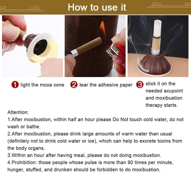 1. Сначала снимите прижигание, зажгите конус мокса и разорвите клейкую бумагу. 2. Затем Наклейте его на необходимые акупунктурные точки и начинается прижигание. 3. Затем дождитесь конуса moxa до конца. 4. Последнее, пожалуйста, обратите внимание, это нормально, если на вашем теле есть какие-то пятна или водяные бусины.