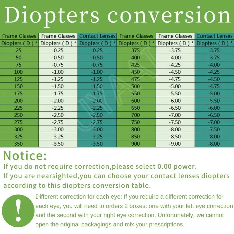 Как выбрать Если у вас нормальное зрение или вам просто нужно украшение, выберите-0,00. Если вы все еще не знаете, как выбрать или не нашли то, что хотите, пожалуйста, свяжитесь со службой поддержки клиентов для получения помощи. Пожалуйста, обратите внимание: Если вам требуется различная коррекция для каждого глаза, вам нужно будет заказать 2 коробки, один с левой коррекцией глаза, а второй с правой коррекцией глаза. К сожалению, мы не можем открыть оригинальную упаковку и смешать ее для вас.