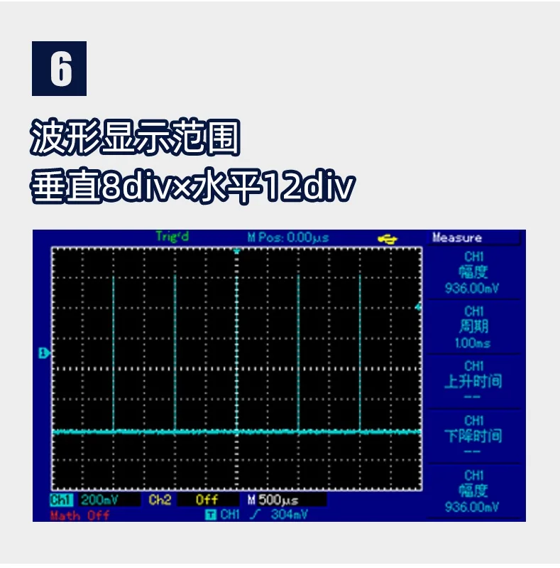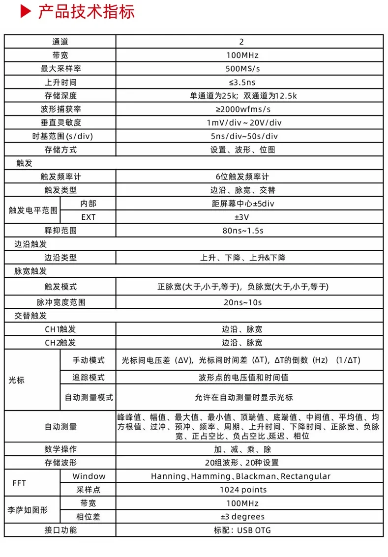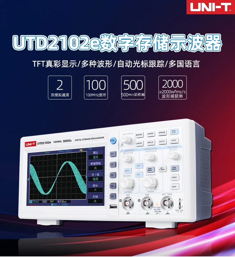 UTD2102e is cost-effective benchtop digital storage oscilloscope with 8-inch screen, 800×480 high resolution display, 1GS/s sampling rate, 20,000wfms/s waveform capture rate, 25kpts memory depth, a variety of trigger types, which is more suitable for general signal measurements. 1. 2 channels 2. 70MHz/100MHz bandwidth; 1GSa/s real-time sampling rate 3. Up to 28Mpts memory depth 4. Calibration signal output: 10Hz, 100Hz, 1kHz (by default), 10kHz or 100kHz 5. Max 10Mpts waveform record 6. 8-inch TFT LCD, WVGA (800X480)