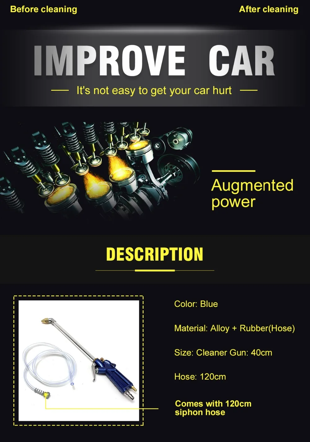Цвет: синий Материал: сплав + резина (шланг) Размер: Пистолет-очиститель: 40 см Шланг: 120 см