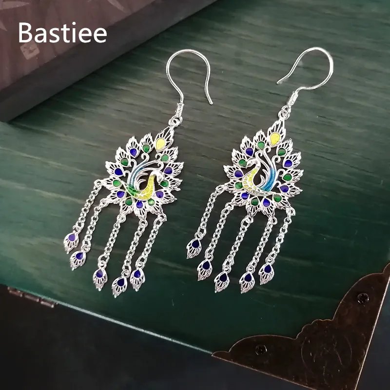Женские серьги с павлином Bastiee, Винтажные серьги из стерлингового серебра 999 пробы с эмалью в этническом стиле, ювелирные изделия ручной работы
