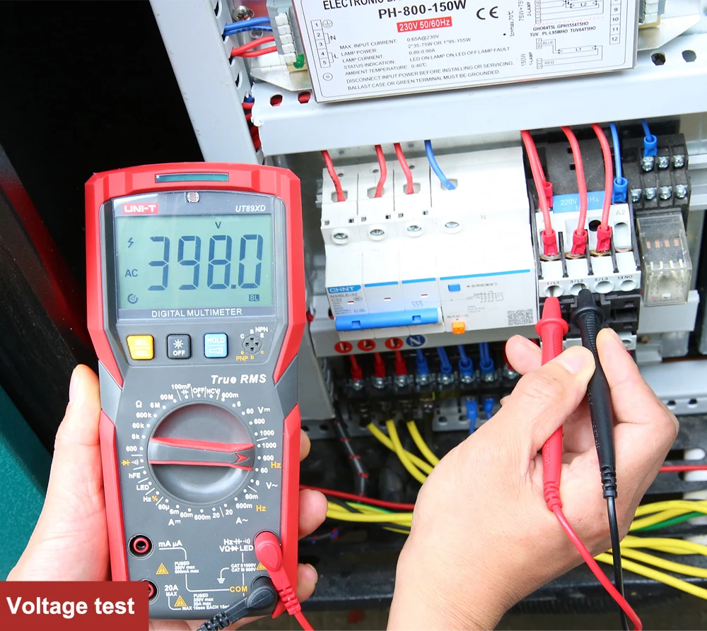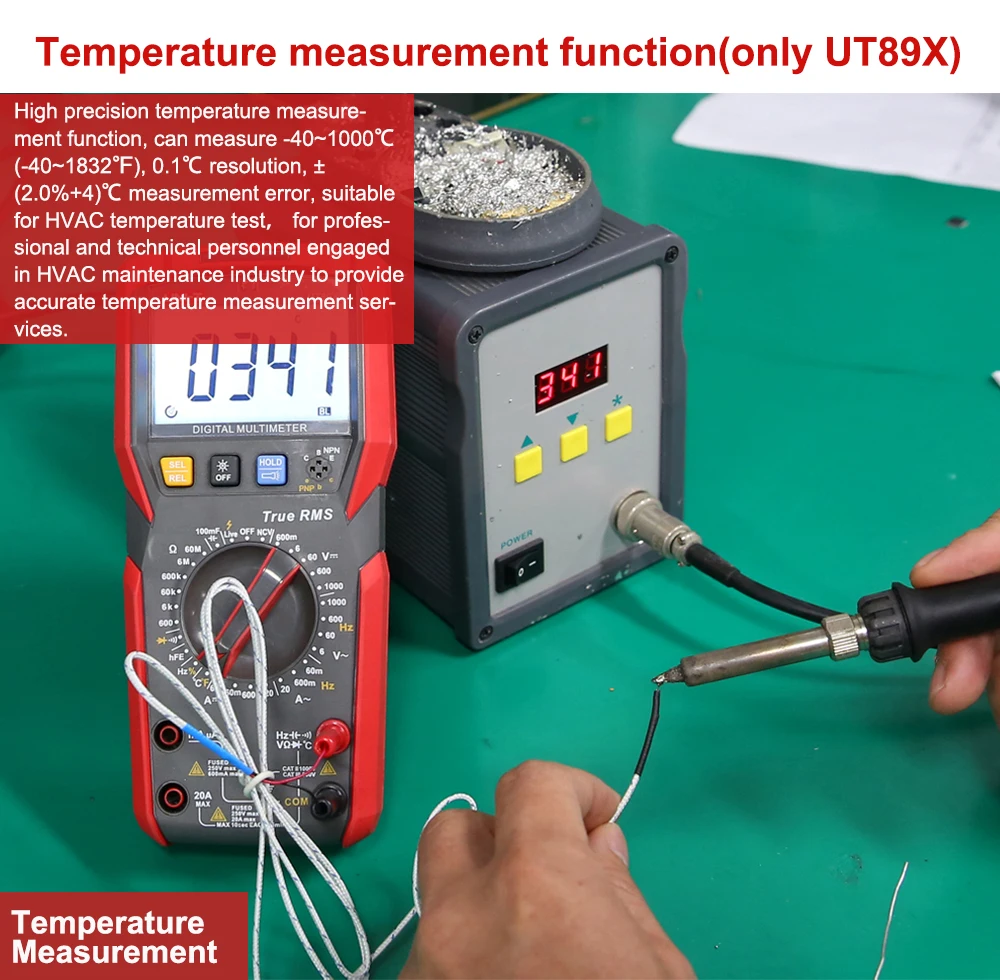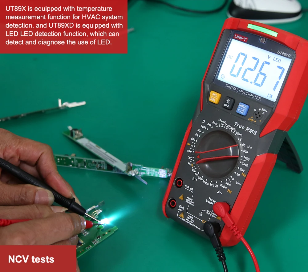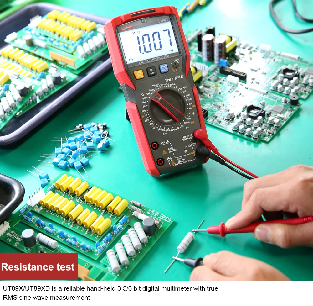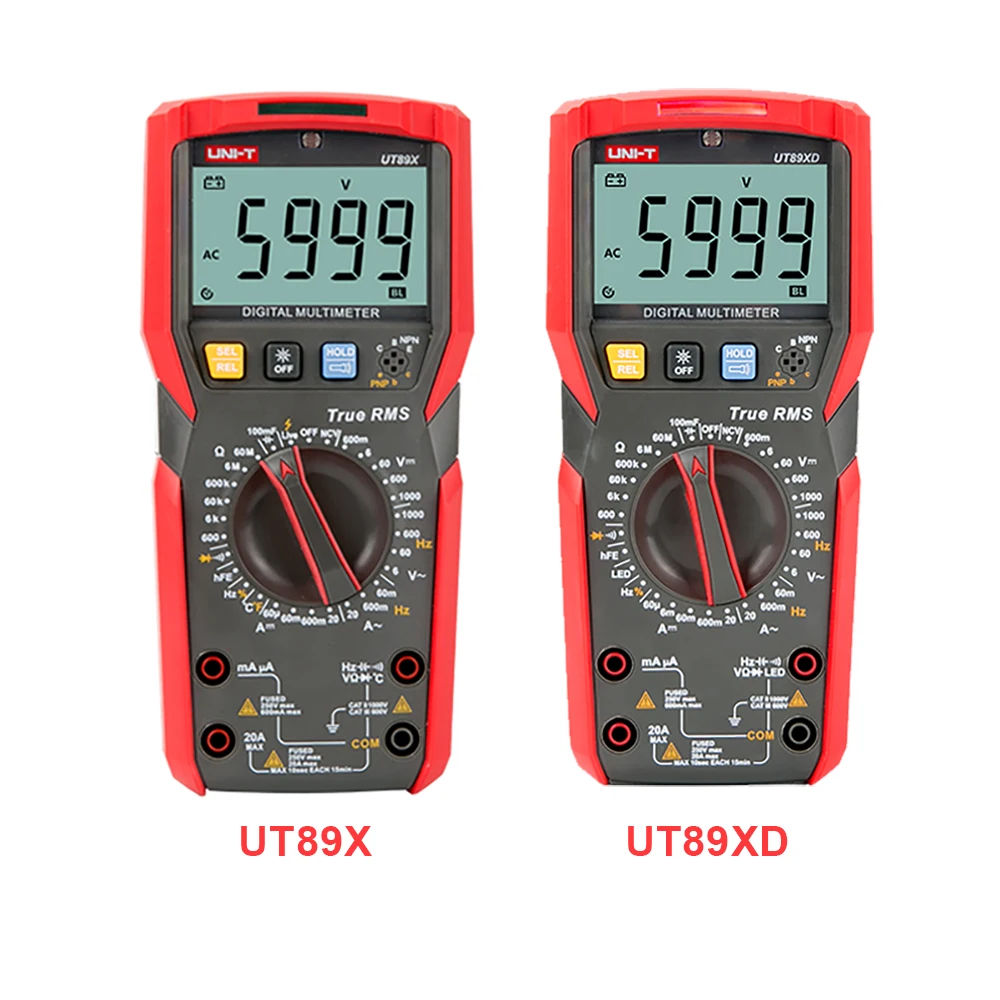 UT89X/UT89XD-это надежный Ручной цифровой мультиметр 35/6 бит с истинным измерением синусоидальной волны RMS. Он может измерить Макс. 1000 В постоянного/переменного напряжения, Макс. 20A DC/AC Ток, сопротивление, емкость, частота, диод, hFE, непрерывность и NCV, быстрое различие между нейтральными и живыми проводами точно. UT89X может измерять температуру и обнаруживать нейтральные и живые провода с тестовым руководством. UT89XD может выполнить светодиодный тест. Оснащенный звуковым и видимым сигналом, фонариком и функциями автоматической подсветки, эта серия может использоваться в темной среде. Он привлекает пользователей своим двухцветный прочный Чехол, современный внешний вид и множество функций.1. 1000 В AC/DC; 20A AC/DC2. Истинный RMS, 6000 граф3. Двухдиапазонный NCV тест, который быстро определяет нейтральные и живые проводаИнтенсивный сквозной светильник4. Светодиодный индикатор измерения5. Звуковая/визуальная сигнализация6. Индикатор зарядки конденсатора7. Эргономичный дизайн8. Двойное литье под давлением9. 1 м защита от падения10. Фонарик; Автоматическая подсветкаТехнические характеристики | Диапазон | UT89X | UT89XD |