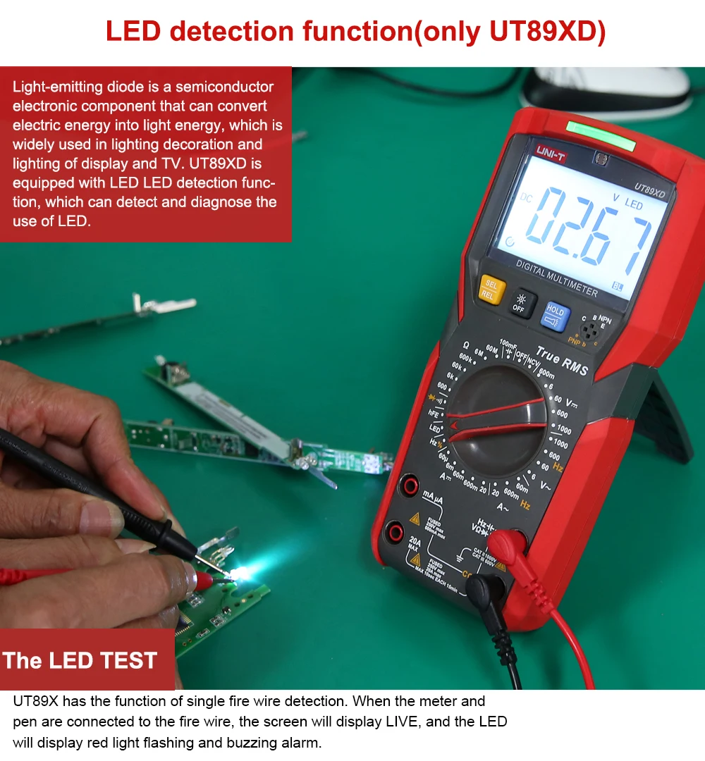Звуковая/визуальная сигнализация | V/A/Cap/диод/hFE/NCV/Live (UT89X)/светодиодный (UT89XD) | ||