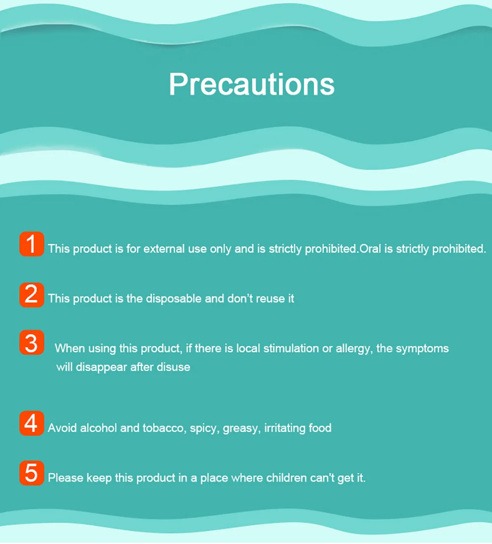 1. Этот продукт предназначен только для внешнего использования и строго установлен. Орально строго запрещено. 2. Этот продукт является одноразовым и не повторно использовать его. 3. При использовании этого продукта, если есть местная стимуляция или аллергия, то после отключения пропадет симптом. 4. Избегайте алкоголя и табака, острого, жирного, раздражающего питания. 5. Храните этот продукт в месте, где дети его не получат.