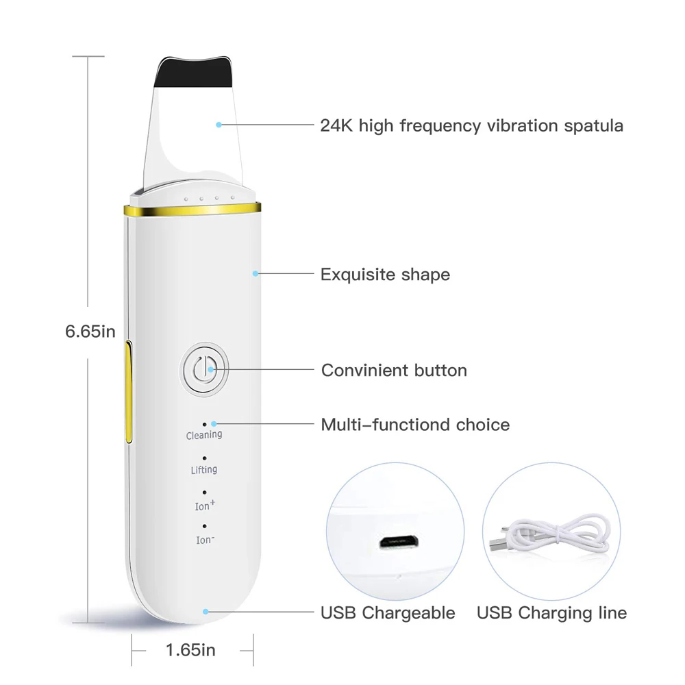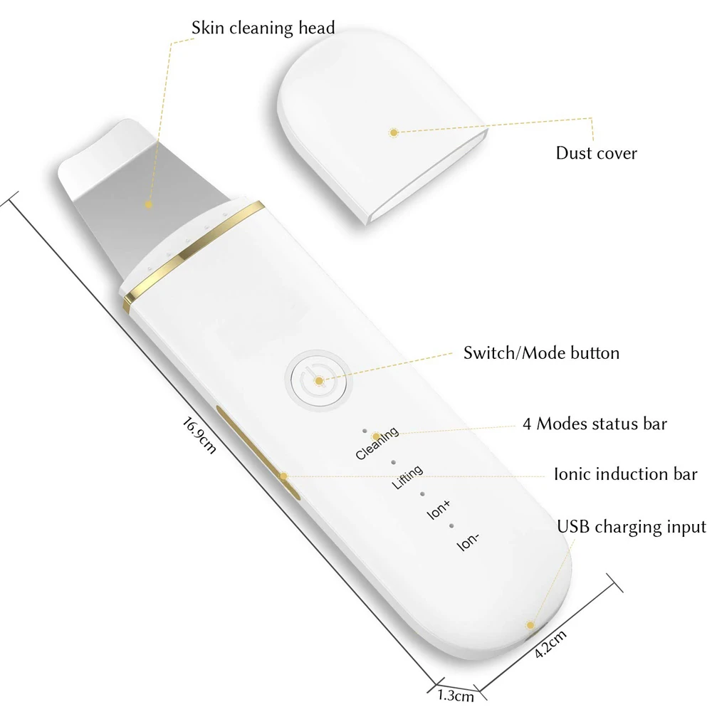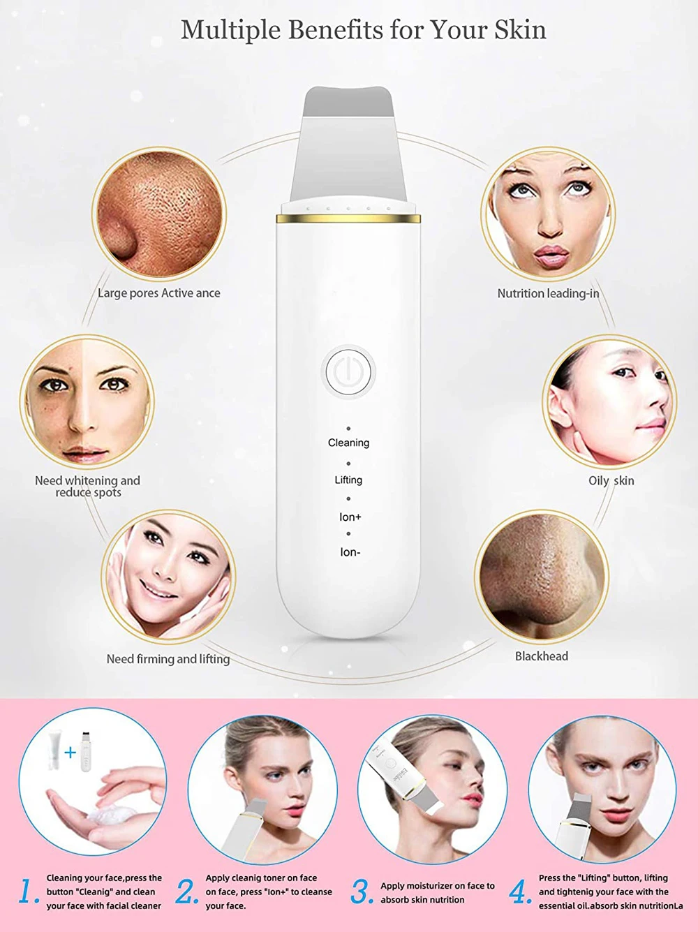 • [Усовершенствованная ультразвуковая очистка кожи] наше косметическое устройство с 4 функциями использует новейшие немецкие технологии, в том числе 24000 раз/мин очистка, Ион + удаление, ионно-Влага и EMS лифтинг, которые эффективны, средство для очищения лица, удаления омертвевшей кожи, удаления угрей и прыщей, остатков макияжа и масла для удаления пор, лечения акне, Впитывание питательных веществ, средство для удаления морщин, против старения, подтяжки кожи, лифтинг лица и безопасно подходит для всех типов кожи • 【Регулируемая 4 modes】чистка: глубокое очищение кожи и удаление грязи и масла высокочастотными вибрациями. Лифтинг: помогает уменьшить морщины и тонкую линию, делает вашу кожу еще яркой и подтягивает. Ion +: помогает вынуть черные головки, омертвевшую кожу, грязь или масло. Ион-: помогает коже впитывать питание и способствует поглощению продуктов по уходу за кожей • [Как использовать] сначала очистите лицо и откройте поры горячим полотенцем или отпаривателем, затем включите скруббер и выберите, какой режим вам нужен. Применяйте соответствующие средства по уходу за кожей в режиме (очищение/режим Иона +: очищающая пена, Глубокое Очищающее Масло, очищающая пена, тонер; Лифтинг/ионный режим: питательная эссенция, эфирное масло) И аккуратно перемещает шпатель машины по всему лицу. (★Предостережения: Избегайте окружающего глаза или любой РАН) • [Красивый дизайн] шпатель изготовлен из 100% нержавеющей стали, которая безопасна в использовании. Этот инструмент для отшелушивания кожи маленький, легкий и удобный в переноске. Встроенный литиевый аккумулятор емкостью 500 мА · ч, вы можете зарядить его через ПК, внешний аккумулятор и т. д. через usb-кабель. Использование цвета роскошного золота делает машину популярной среди всех возрастных клиентов независимо от того, женщины или мужчины. Дизайн с эргономикой, легко для всех, чтобы держать кожу скруббера • 【Комплектация включает в себя 1x Резиновый каучук, 1 кабель для зарядки xUSB, 1 руководство пользователя.★Примечание: Не используйте устройство во время зарядки! Просто наслаждайтесь молодостью и красотой. Если у вас есть какие-либо вопросы, вы можете связаться с нами в любое время